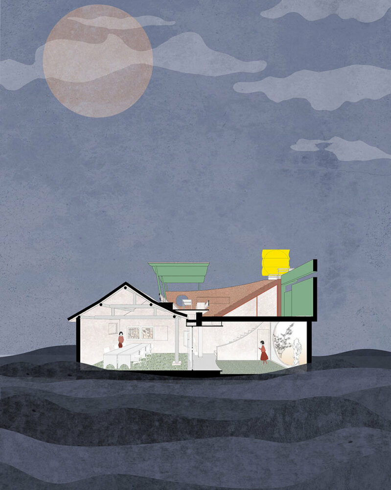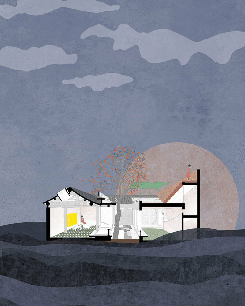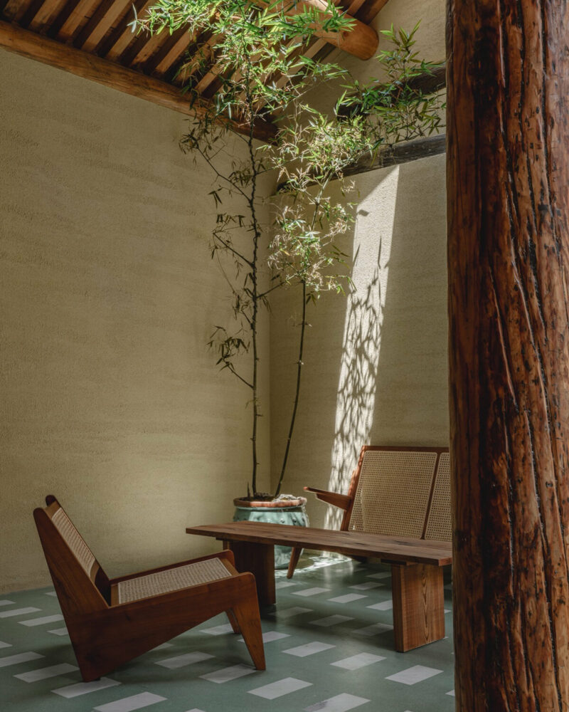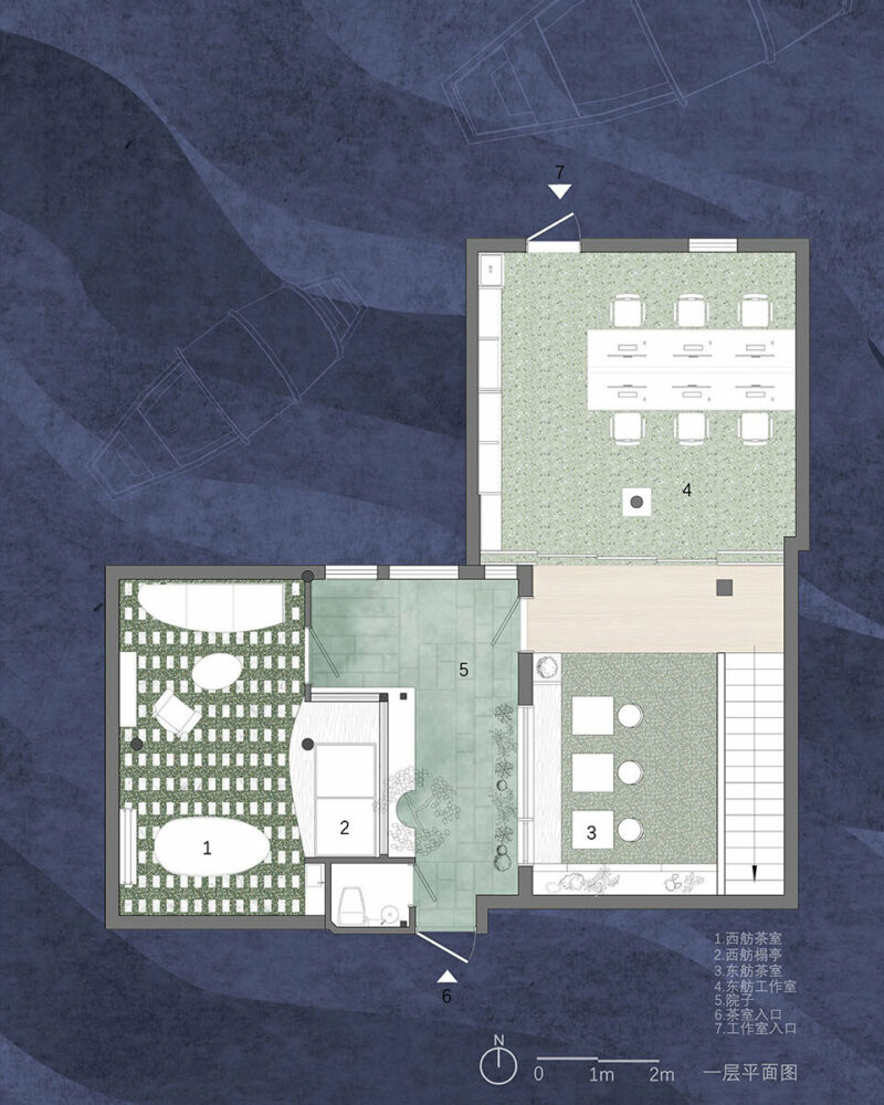 the green-canopied boat on the second-floor terrace resembles a ship, creating a tea pavilion space