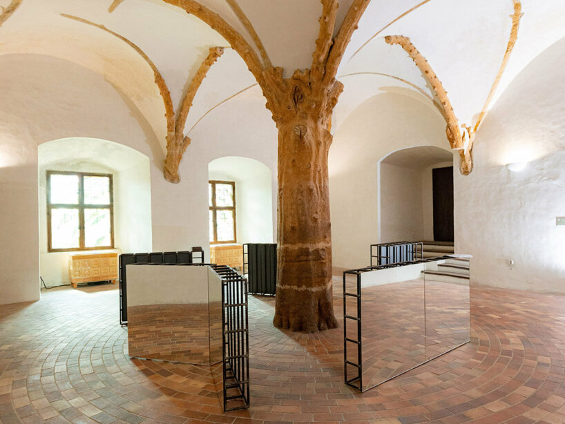 the project sits like a ring placed over the terrain, with its funnel-like roof forming a shaded perimeter walkway and an introverted core.