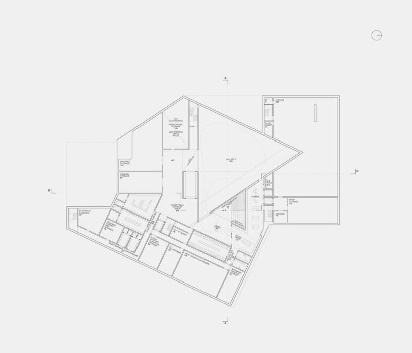 the project sits like a ring placed over the terrain, with its funnel-like roof forming a shaded perimeter walkway and an introverted core.