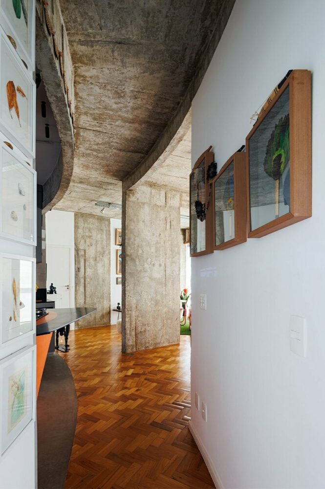 Unveiling the concealed beauty of the concrete structures, which were artfully camouflaged behind an array of materials, Vasconcellos‘ intervention simplifies the interior aesthetic by introducing a uniform flooring solution. The design narrative leans on unconventional materials and forms, injecting a sense of originality into the space while enhancing its fluidity. Emphasizing the significance of natural light and capturing views of the adjacent Municipal Park, the intervention optimizes the visual connectivity with the urban surroundings. The design aligns seamlessly with contemporary lifestyles marrying the old structure with a reimagined living space.