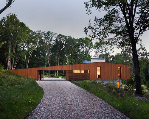 surrounded by an ecological system of cascading rocks and water, ‘the bridge house’ by american architecture studio joeb moore & partners has been constructed in reference to its ever-changing landscape. located in kent, connecticut in america, the building sits along a ridge that runs parallel to the housatonic river and kent falls state park. the geology of this area is formed by alternating hard and soft bedrock layers that eventually erode over time, creating a sense of ebb and flow in the environment. the layout of the volume was informed by covered-wood bridges found near the site, evoking the feeling that it sits loosely in the ground, as the suspended mass is projected over the hillside.
