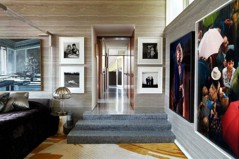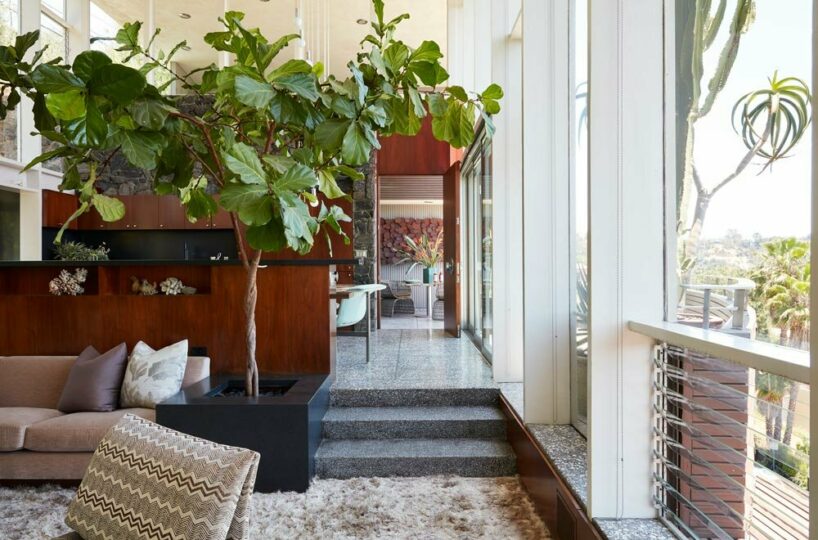 Apart from the iconic roof, John Lautner‘s masterpiece exhibits timeless classics, including a lava rock entryway, original terrazzo flooring, and a vast wall of windows. Standing only on slender V-shaped stilts, the project seems to defy the gravity rules. The floor-to-ceiling openings frame sweeping vistas of Los Angeles, flooding the inside with ample light and green pops. A hillside descent meanders users through a leafy scheme, designed by landscape architect John Sharp, and guides them to an eye-shaped pool. The stunning pool was added in 2008 and follows the shape of its signature parabolic roof, creating a blue oasis within the lush surroundings.