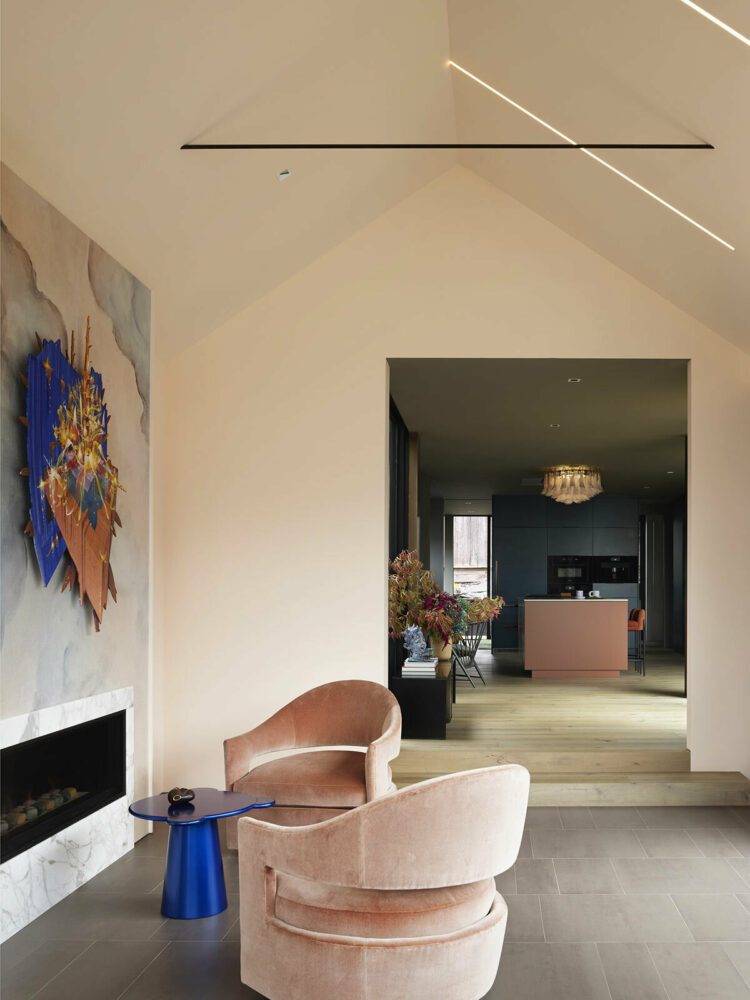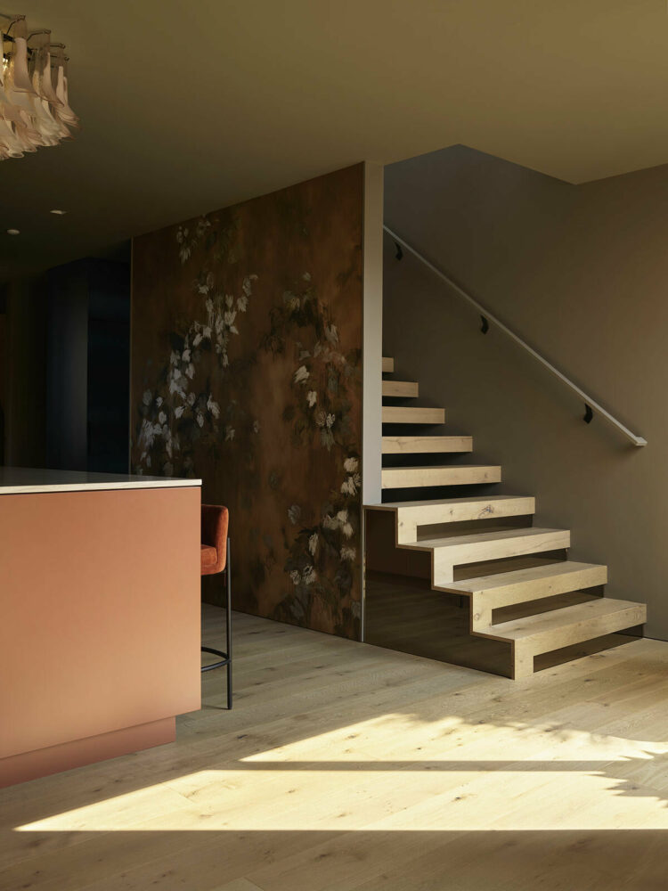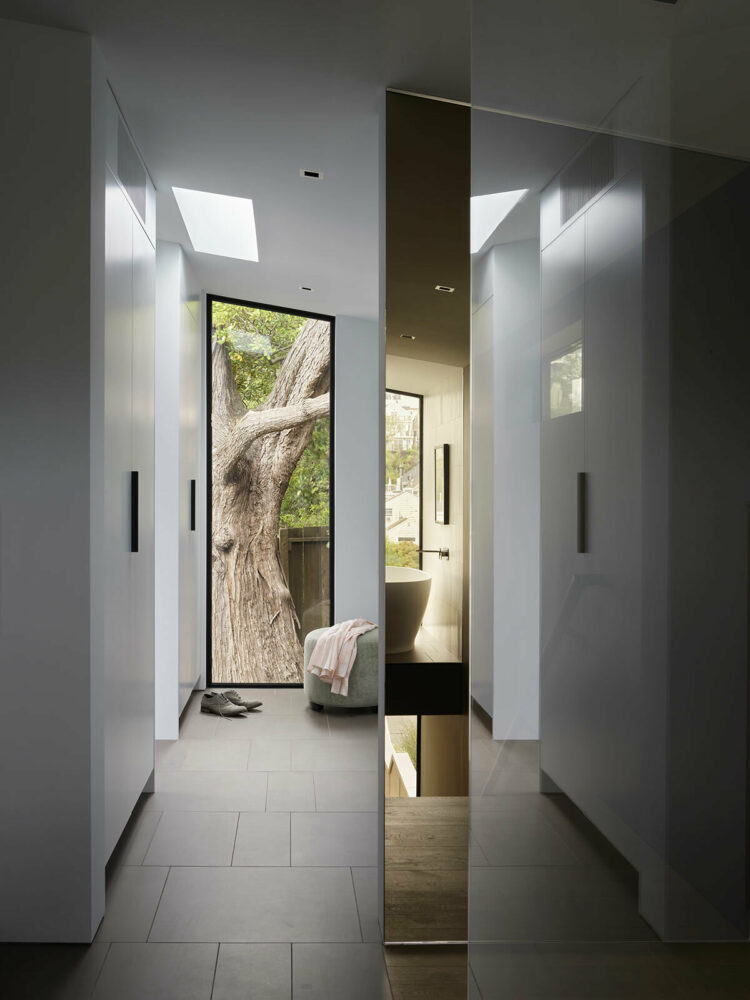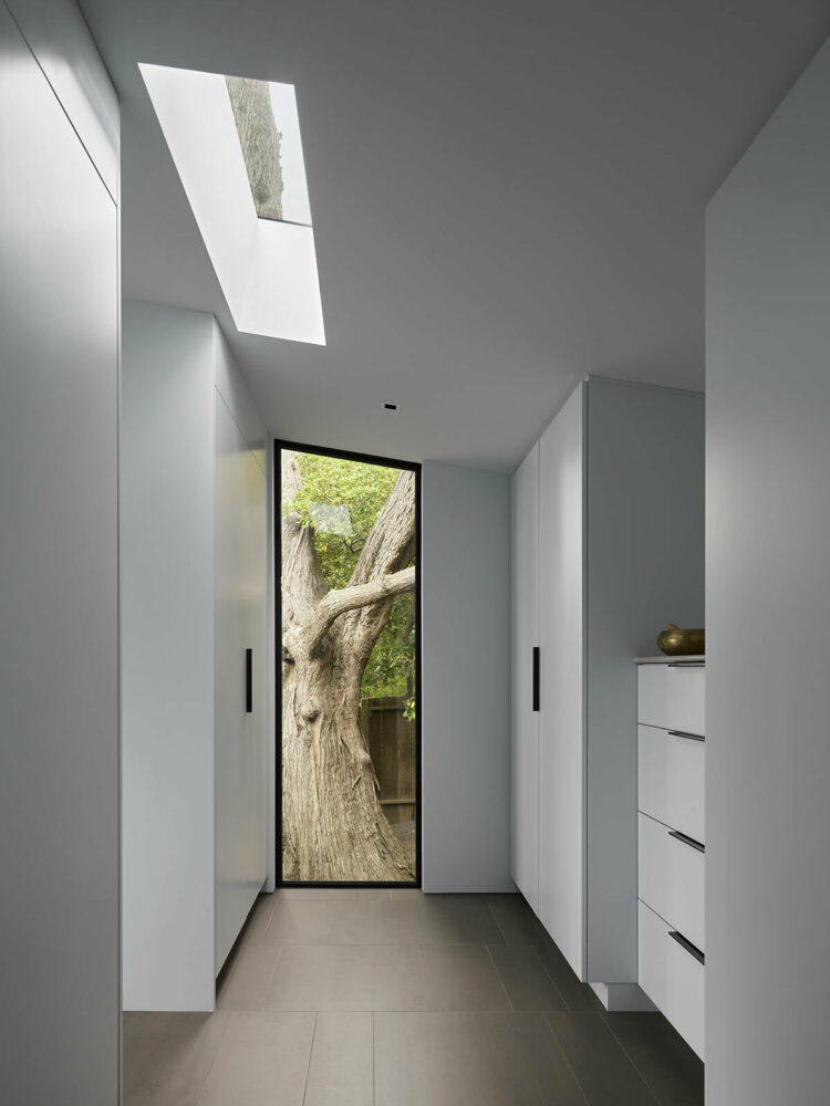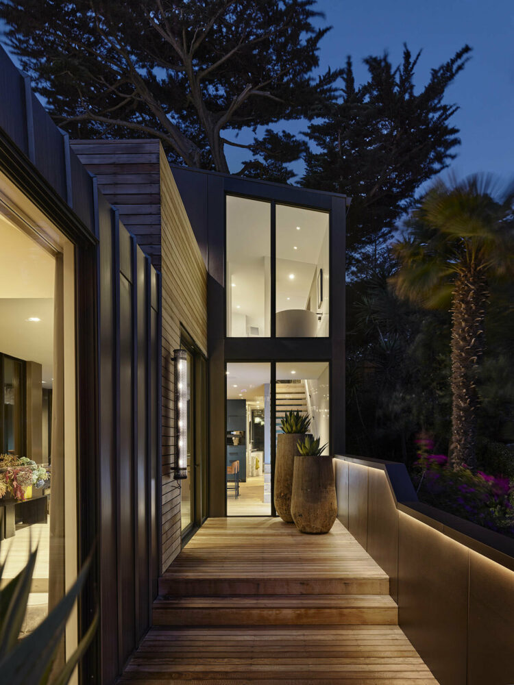 Interiors by Kevin Sawyers of Sawyers Design are infused with with organic inspiration and provide a glimpse into the intricate ‘trunk’ level of the forest. Above, a panoramic roof deck extends the living space, offering an elevated encounter with the ‘canopy’ level of the surroundings. This elevated vantage point offers an intimate connection with the familiar gable profile, a symbol of home.