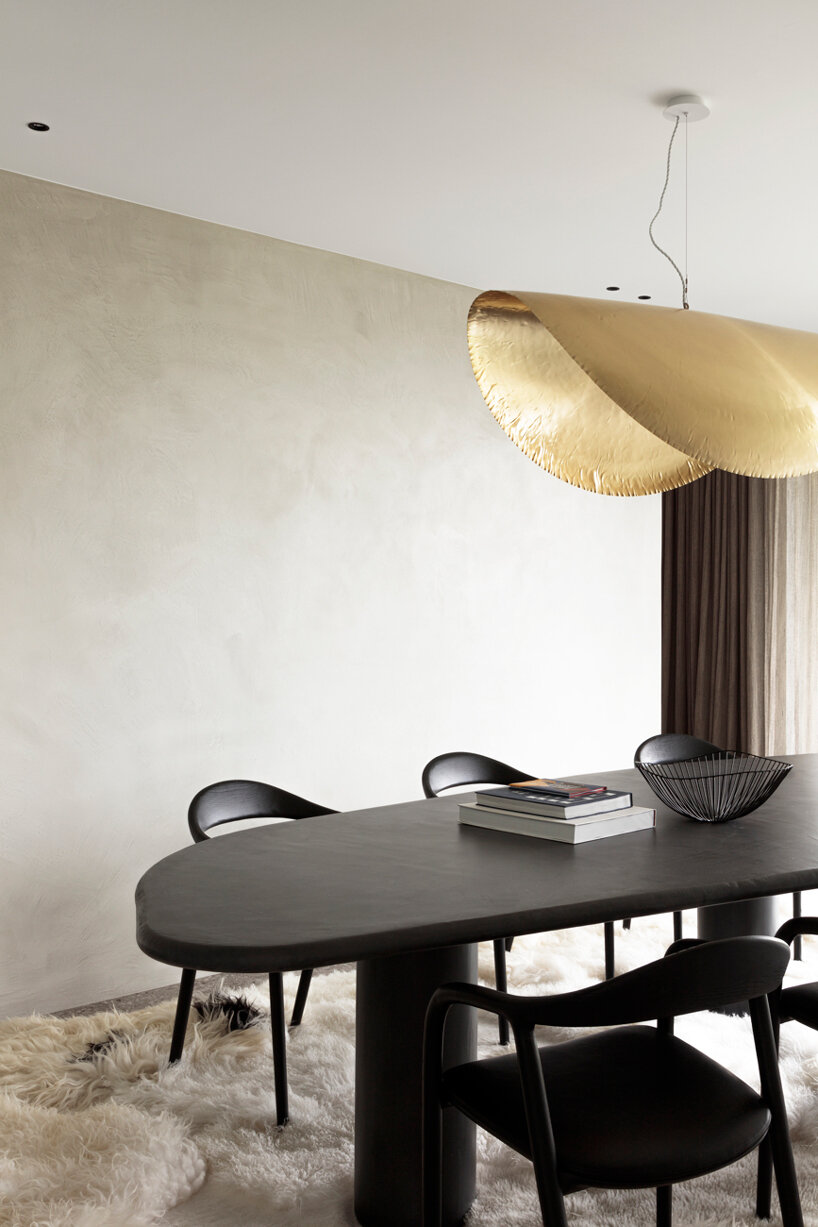 The interiors were envisaged to flow seamlessly from the exterior through the consistent use of a uniform color palette. Elements of burnt wood cladding continue inside while light earthy tones create a calm, homely atmosphere. Other finishes include light-colored tadelakt on the dining room walls, bespoke oak veneer cupboards, and a sandblasted travertine kitchen counter. The house features black accents throughout, except in the master bathroom. Here, JUMA opted for brass accents to emulate the luxuriousness of a hotel room. The master even opens out to the terrace so the residents can walk straight out for a splash in the pool.