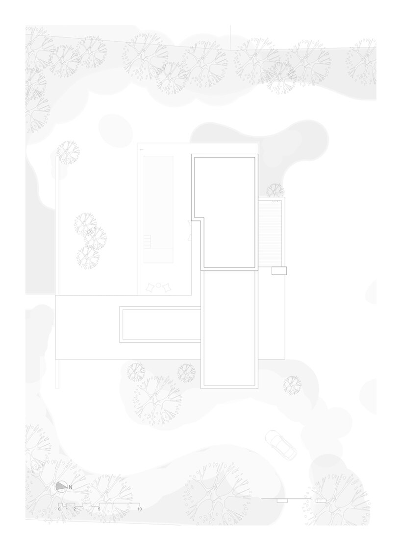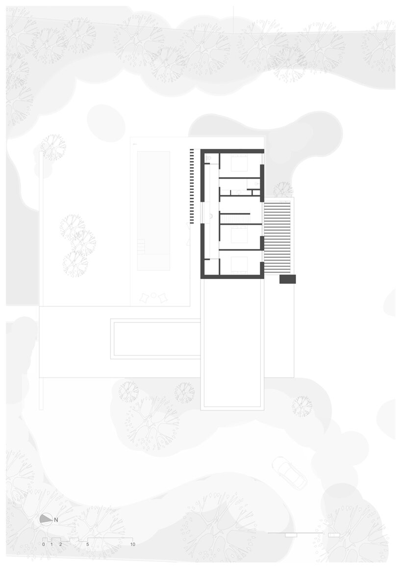 The main program is contained within the longer volume. The first floor hosts a kitchen, living room, dining room, and the master bedroom with an ensuite bathroom and dressing room at the far end.