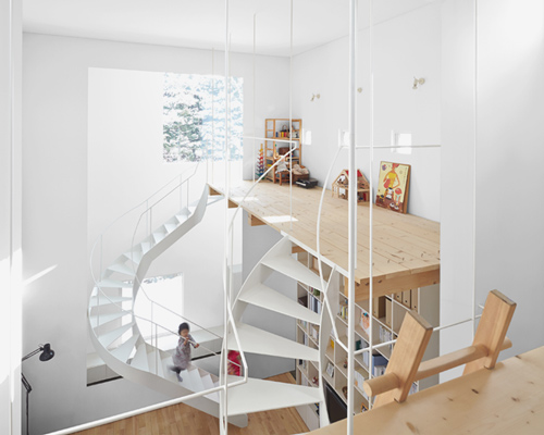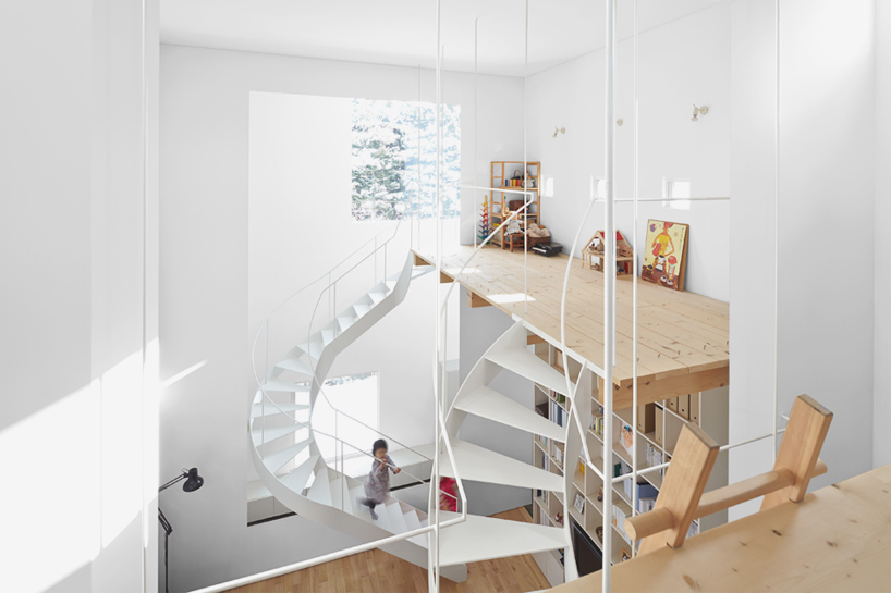 located in northern japan, in a suburb of sapporo, jun igarashi has designed a three storey residence articulated around a dual set of spiral staircases. titled ‘case’, the dwelling features a number of secluded alcoves that provide privacy, while simultaneously ensuring that each area is filled with natural daylight. carefully positioned apertures at each level of the design allow for pleasant views, while externally, a buffer zone is created through the deployment of stainless steel wires that encourage vegetation to surround the property, enclosing the façade’s formal fenestration.