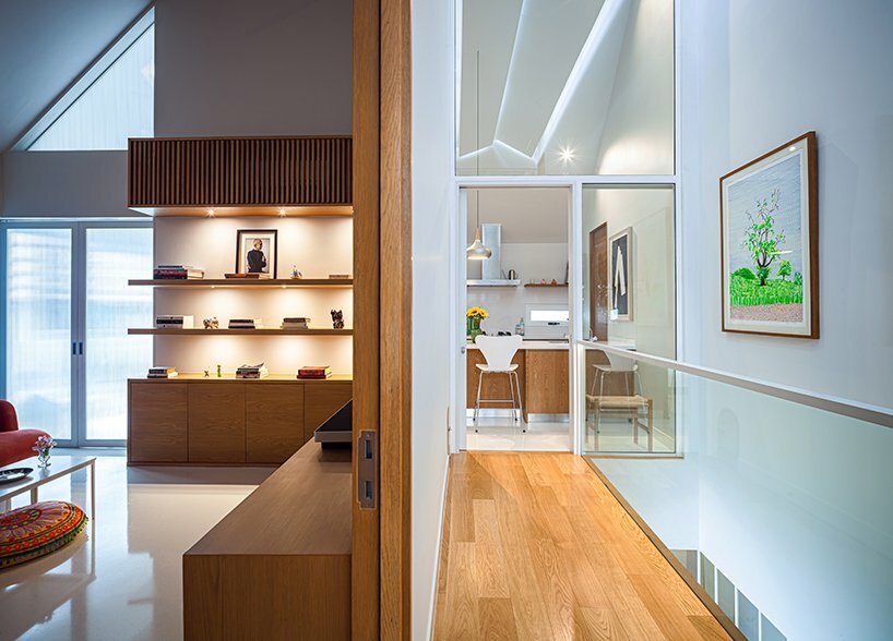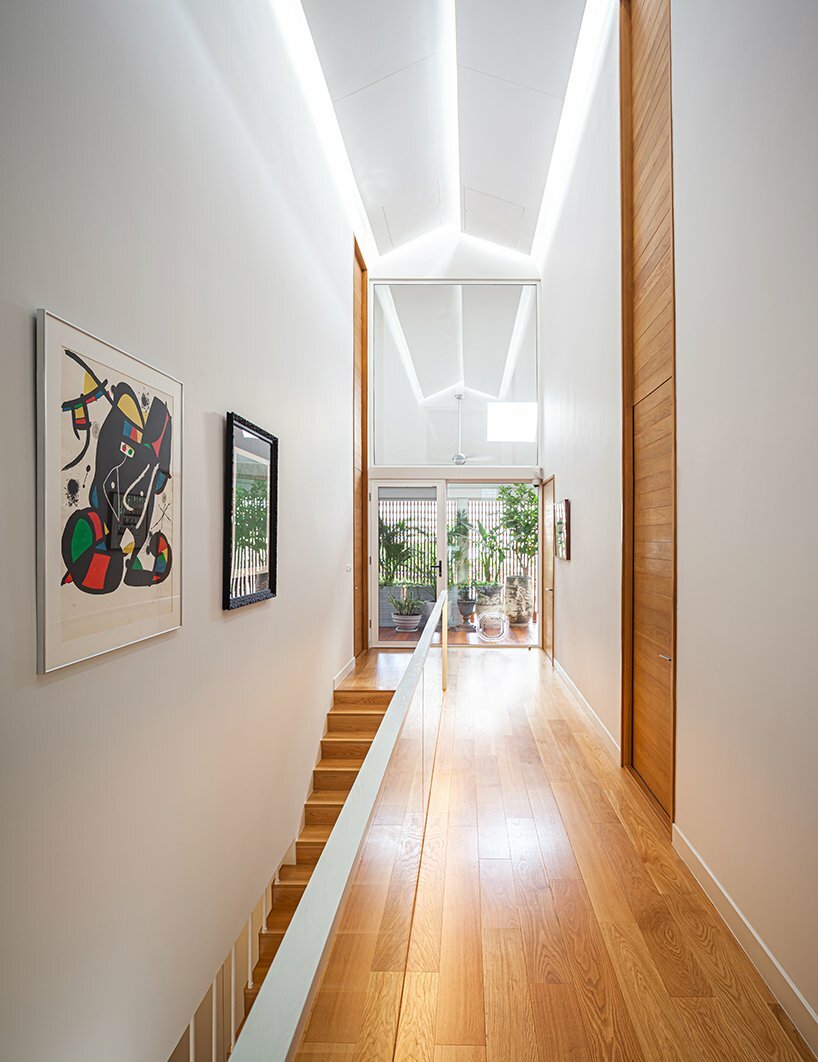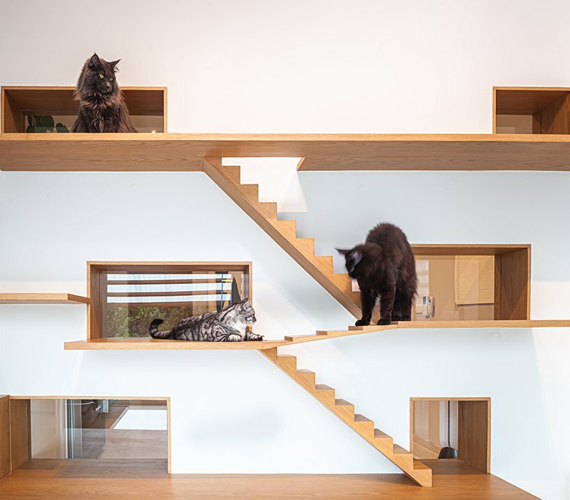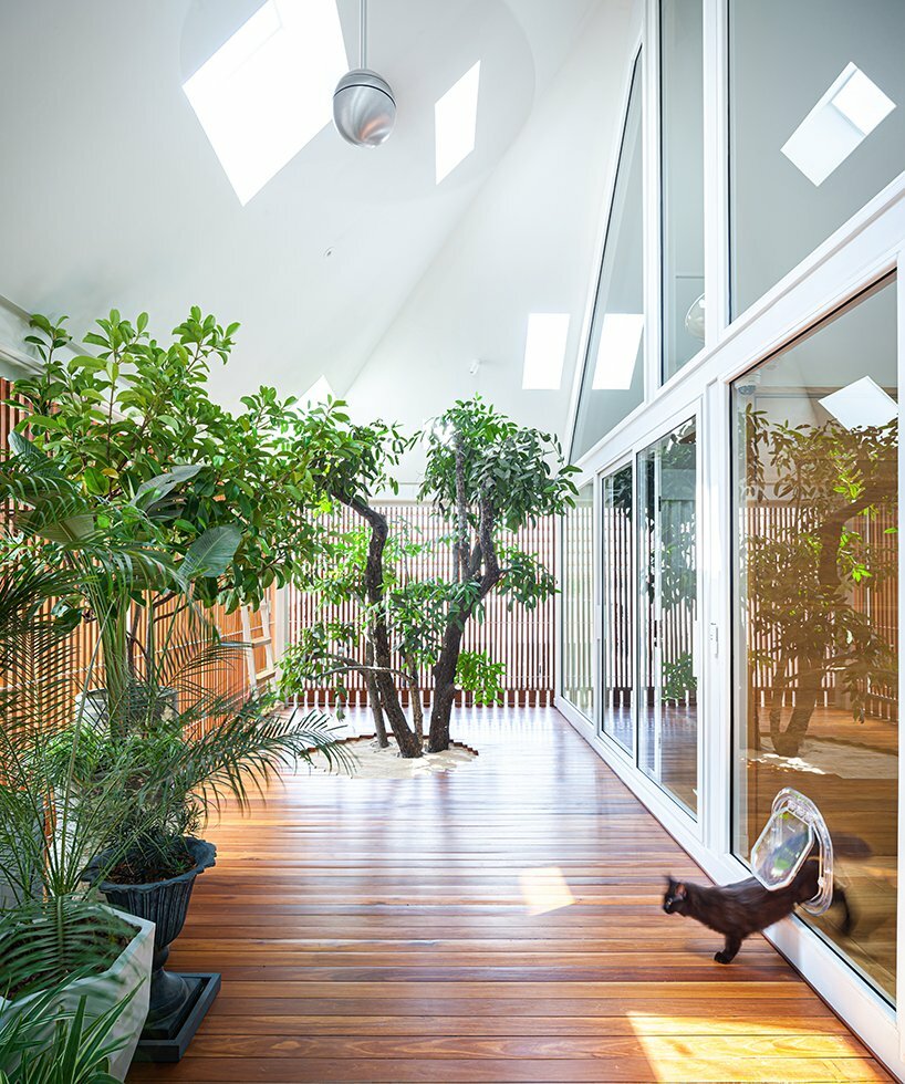 the architect decided to take add skylights to the sloped ceiling, illuminating the interior and bringing occupants an nature closer together. the design incorporates multiple spatial elements that accommodate both the residents and their cats. although the form and space are designed to be simple and straightforward, every detail and juxtaposition of each material is arranged harmoniously, becoming a representative symbol of the owner’s character. the use of translucent materials, including glass block fence and translucent sheet for the eaves, help reduce the solidity of the mass without depriving it of privacy.