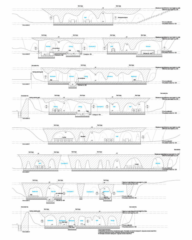 Junya Ishigami and his team celebrate the completion of ‘House & Restaurant‘ in the Japanese city of Yamaguchi. The sculptural work of architecture suggests a naturally eroded landform, recalling the tunnels and rocky vaulting of subterranean caves, and expressing the familiar quality of roughness found in nature.