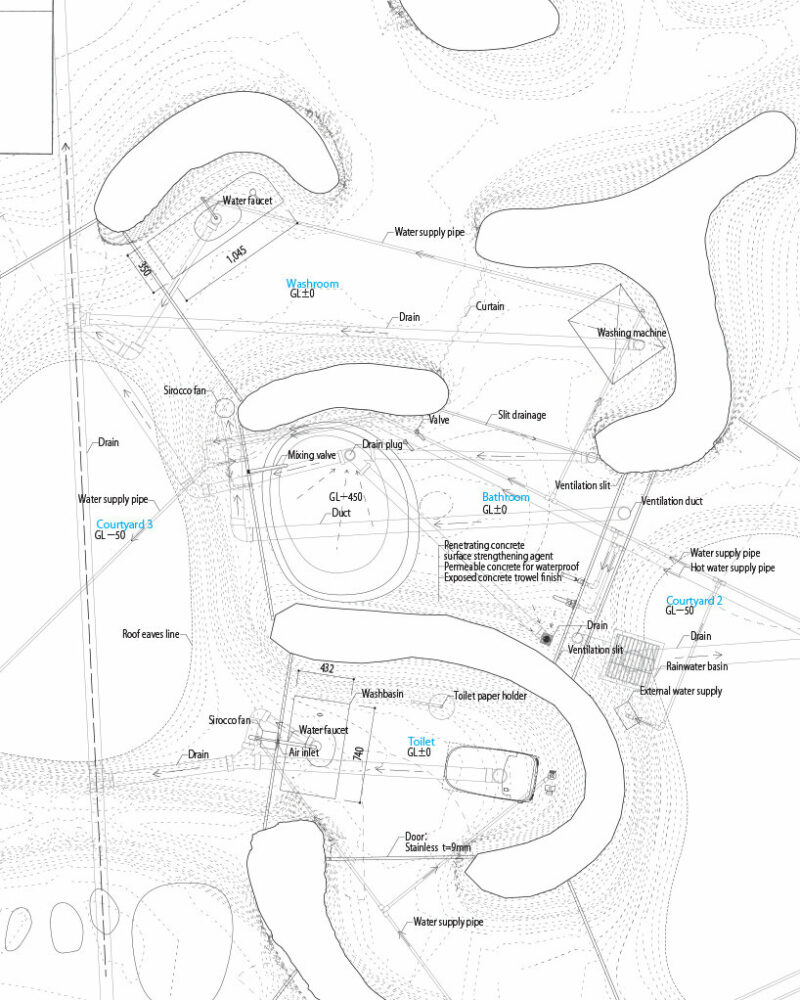 ‘For example, where to fix the glass was adjusted based on actual on-site measurements, and 3D scan data was used to verify that the glass would not break by hitting the structure during the construction nor by opening/closing, and to adjust the position of the hinges. To simplify the plumbing route, the water supply and drainage were planned to pass through the three courtyards in a straight line, and faucets, drainage pipes, ventilation ducts, etc. were installed to penetrate the glass windows into the rooms. Accepting uncertainties, the concrete mass will gradually be transformed into architecture through cut-and-try. The owner will start a life here, run a restaurant, and continue to renew this place.’