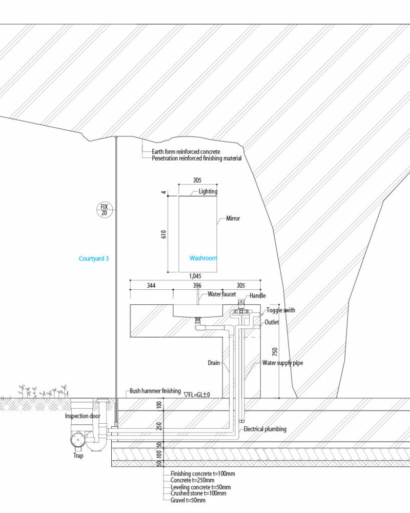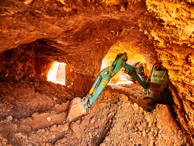 ‘When the structure was excavated after concrete solidification, it was caked with mud. With the range in geology, the nature and appearance of the soil differed from place to place. We originally planned to wash away the dirt to reveal a gray concrete structure. However, we were impressed by how it looked with soil that we decided to leave it as it is. It was then that we sensed the atmosphere of a cave and decided to redesign the building with a new image.’