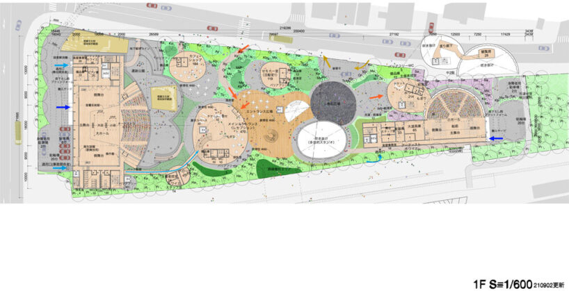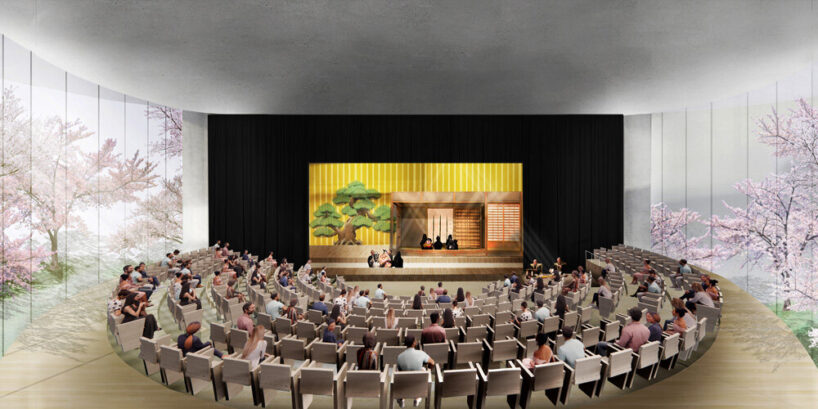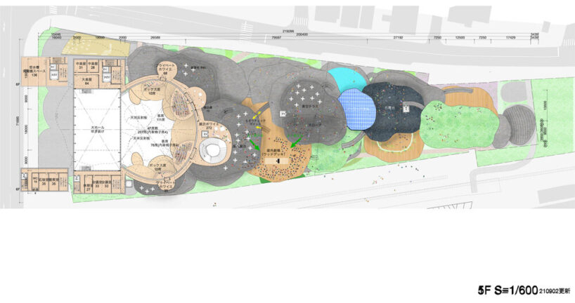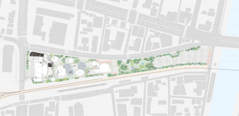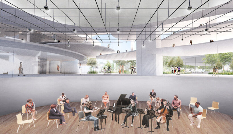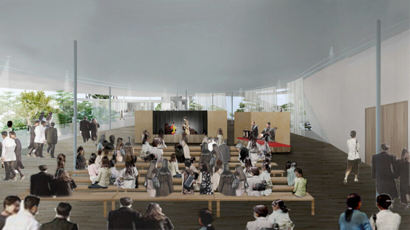 the project sits like a ring placed over the terrain, with its funnel-like roof forming a shaded perimeter walkway and an introverted core.