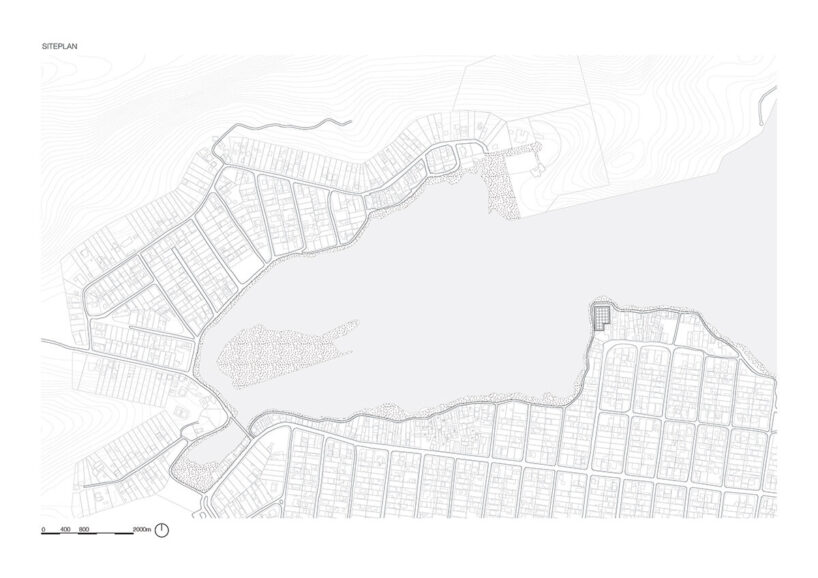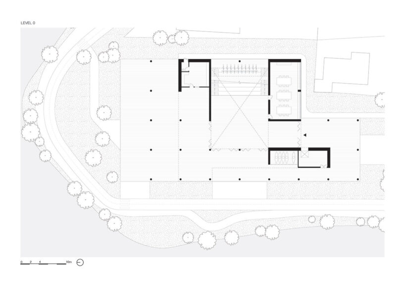 the project sits like a ring placed over the terrain, with its funnel-like roof forming a shaded perimeter walkway and an introverted core.