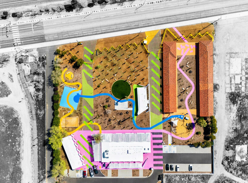 The outskirts of California‘s Mojave Desert have seen a transformation as two derelict motels have become a colorful new Sierras Housing community by Kadre Architects. With its efficient and playful design, the work breathes new life into a neglected space, providing thirty-eight units of transitional residences for previously unhoused families. The project’s success lies in its complete renovation of the former motel site. Gone are the sprawling parking lots, replaced by a park-like atmosphere. Permeable surfaces allow rainwater to replenish the aquifer, while colorful walkways meander through the property, creating a cohesive whole.