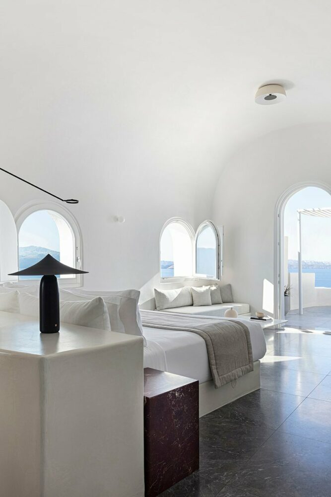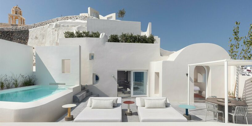 an outdoor yard with a plunge pool, and lounge and dining area overlooks Santorini’s idyllic seascape