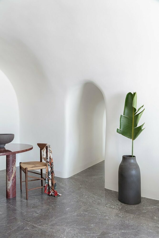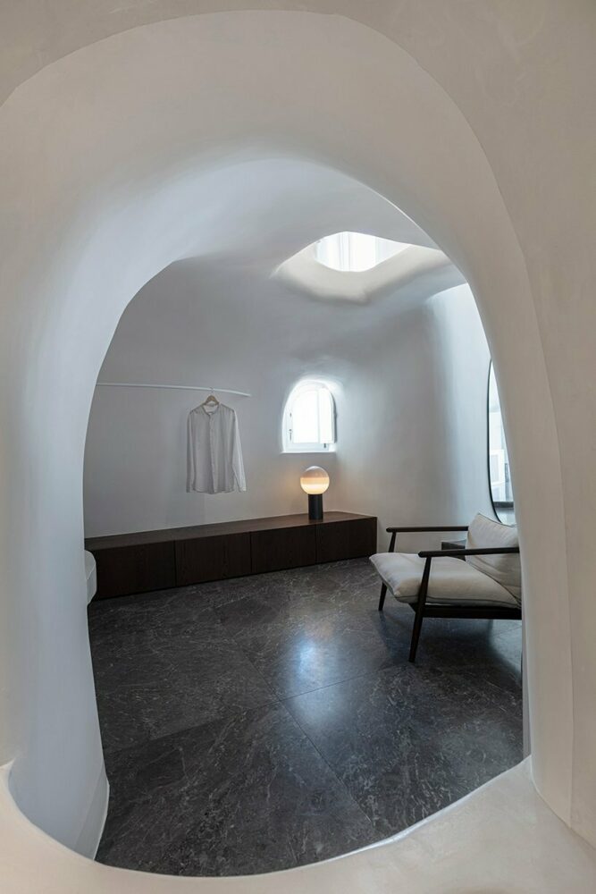the long-vaulted structure composed of various levels echoes the undulating forms of the cliff