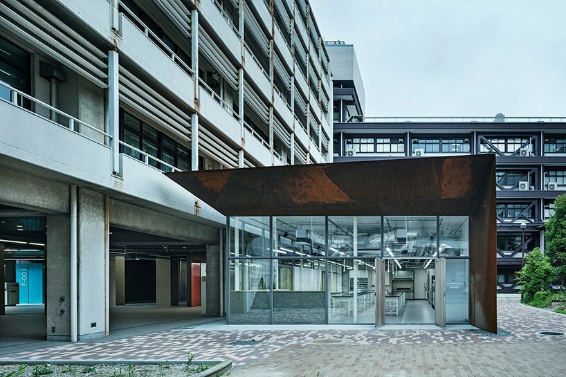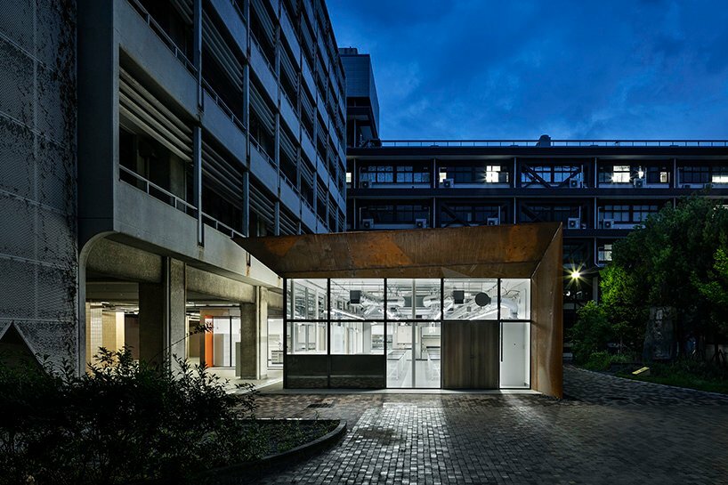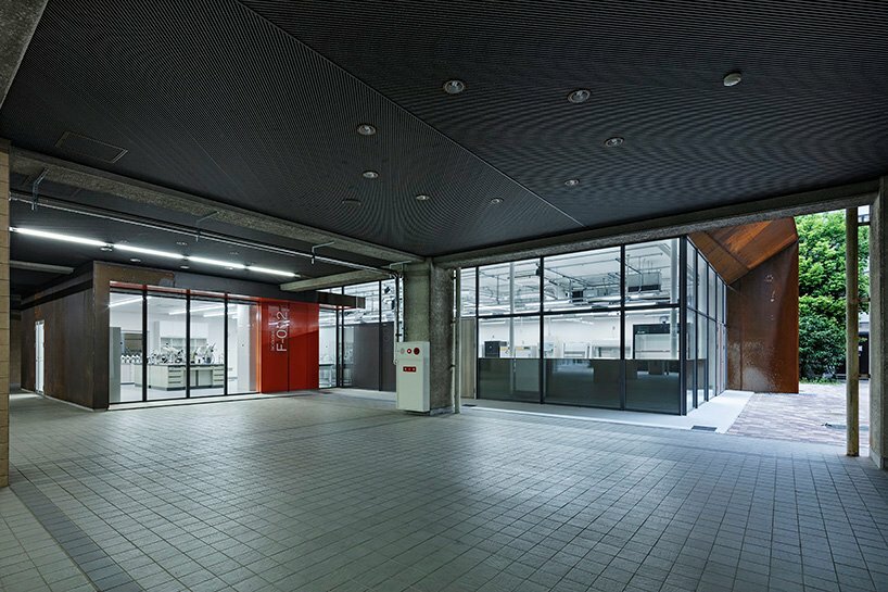 Construction-wise, the preparation rooms took shape within the pilotis holding a low ceiling height, while the laboratories that require sufficient size for ducting were placed outside. When it comes to the materiality palette, the architects chose COR-TEN steel plate; a texture that pops out from its neighbors whilst blending in with the old buildings’ materials. Meanwhile, the roof surface creates a continuity with the facade, acting as an integrated cover that encloses the otherwise glazed sides.