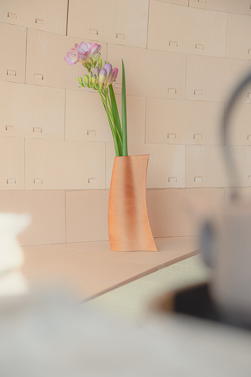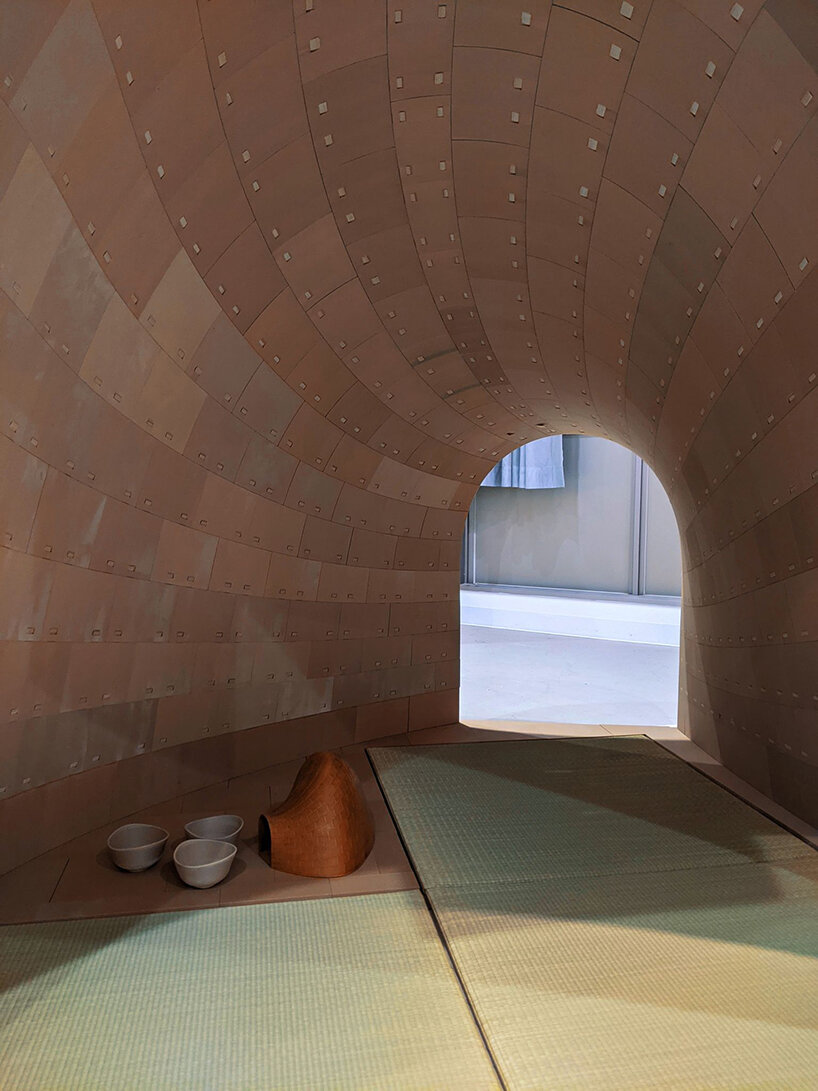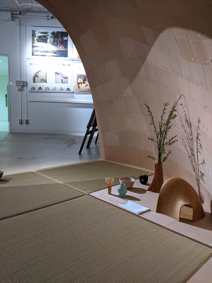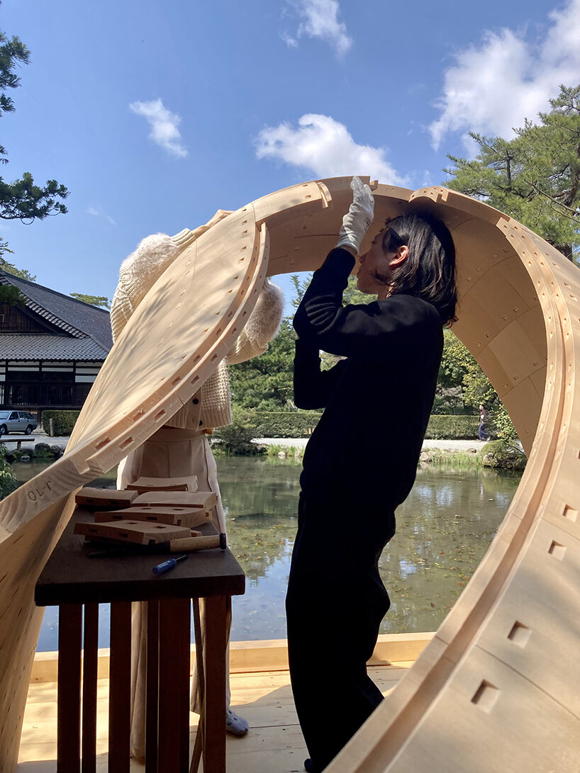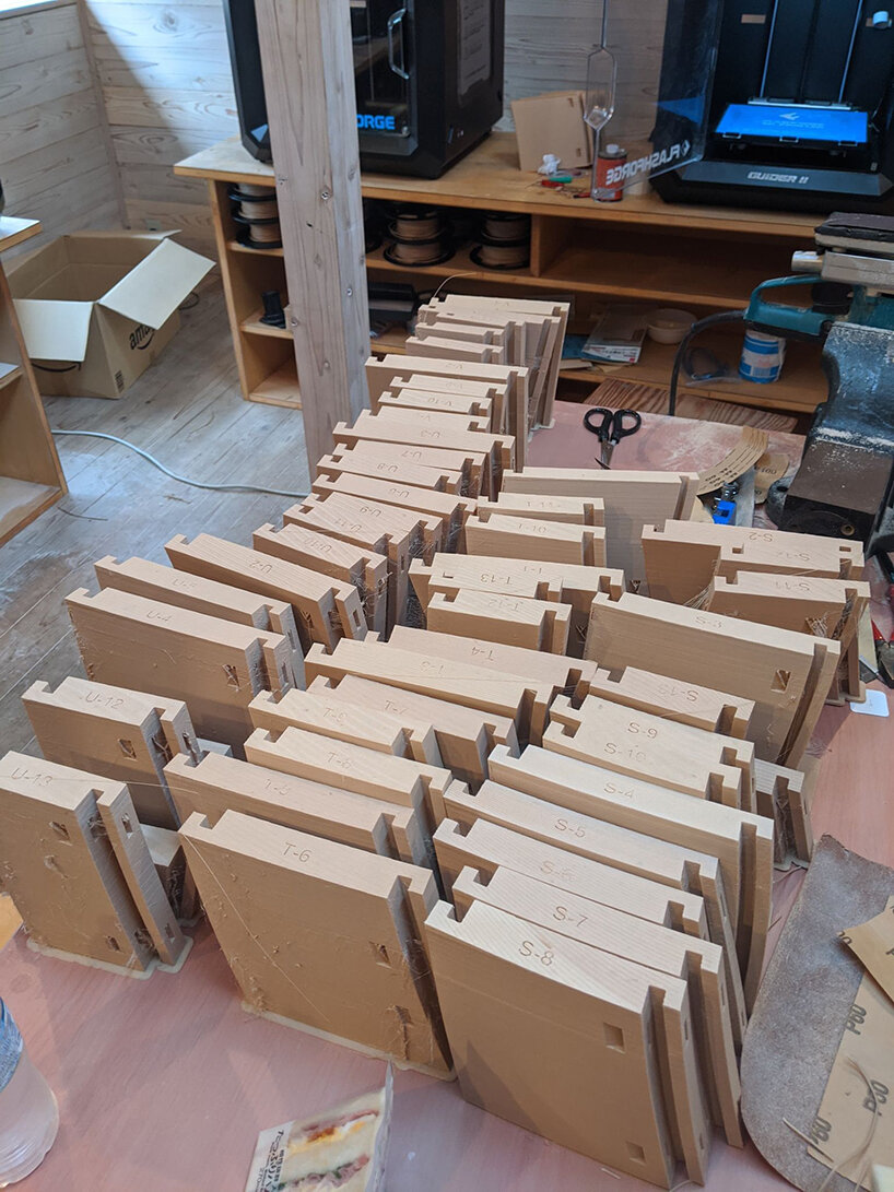 ‘The first stage of research applied to architecture and constructive systems was largely inspired and fueled by traditional Japanese Tsugite and Shiguchi assembly systems for frame structures,’ Kei Atsumi and Nicholas Préaud (see more here) share with designboom. ‘This stage of research and geometric composition was supported by partial prototypes prior to prototyping a complete structure at a 1:1 scale, made possible by investment in 3D printers. The ability to translate digital models into physical objects, whose mechanical behavior could be directly evaluated, was a real asset from the outset and a considerable time saver.‘