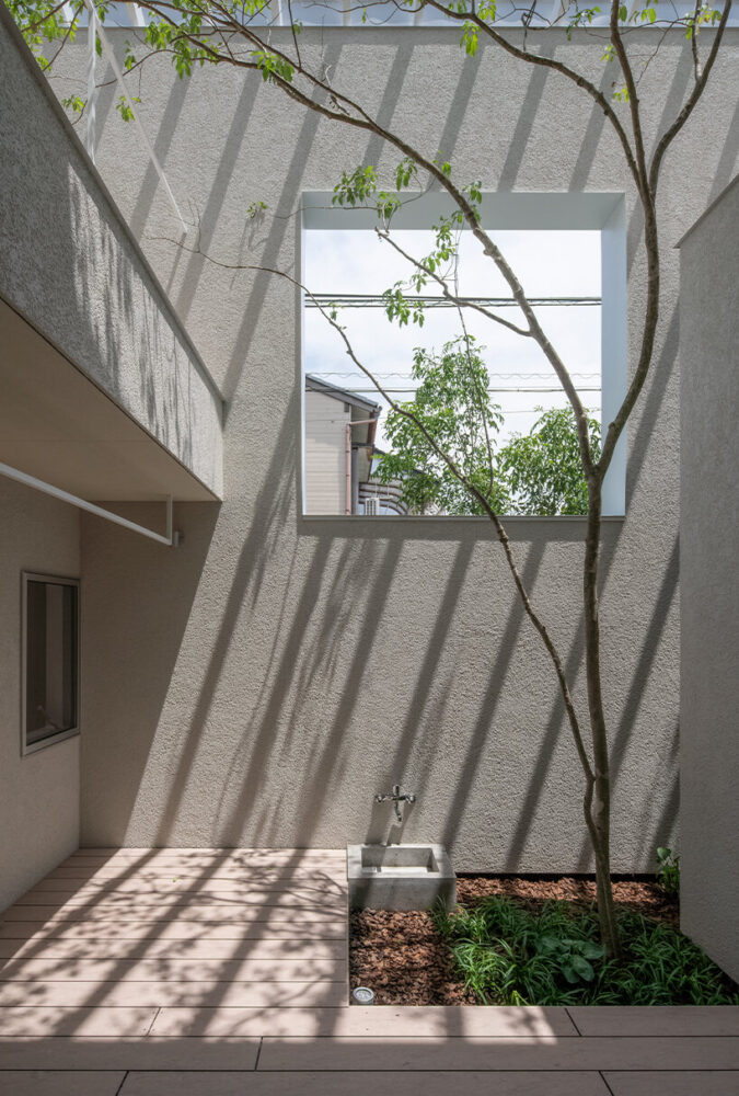 the owners had originally requested a garden as part of the design but due to the lack of privacy in the corner lot, the team at keitaro muto architects dedicated a large chunk of the house volume to designing an outdoor space accentuated by green elements. light-colored wooden floors populate the garden-like area, while a darker parquet defines the interior space – creating a sort of border where one world ends and another begins.