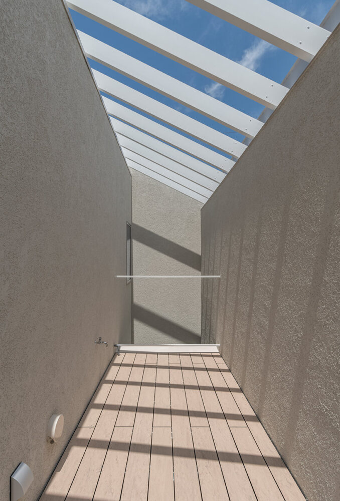 just above the outdoor space, slanted aluminum louvers were installed as an extension of the other half of the roof and allow for natural light to infiltrate. the pitch of the louvers was defined in such a way that brings the space between the interior and exterior closer. meanwhile, the indoor volume overhangs the outdoor space and is characterized by sharp variations in height that are reflected in the design of the exterior.