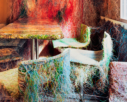 the project predominantly uses recycled materials, including ethernet cables, to give the restaurant its distinctive textured appearance. meanwhile, left-over melted acrylic byproducts have been used to furnish the bar, allowing the form of the space to become invisible with stools and tables appearing to float independently. opposite the bar, a large wall painting by teruhiko yumura complements the scheme with his punk manga motifs serving as the backdrop.