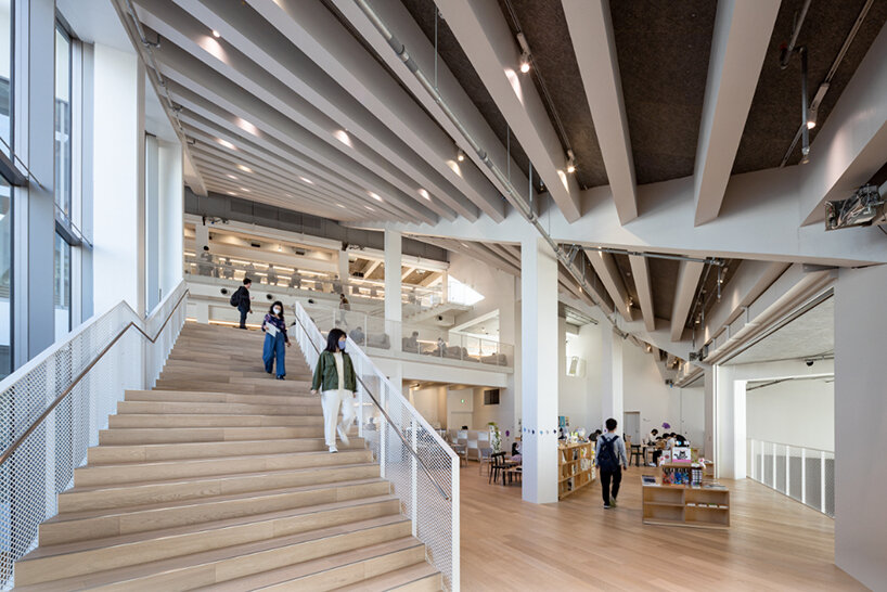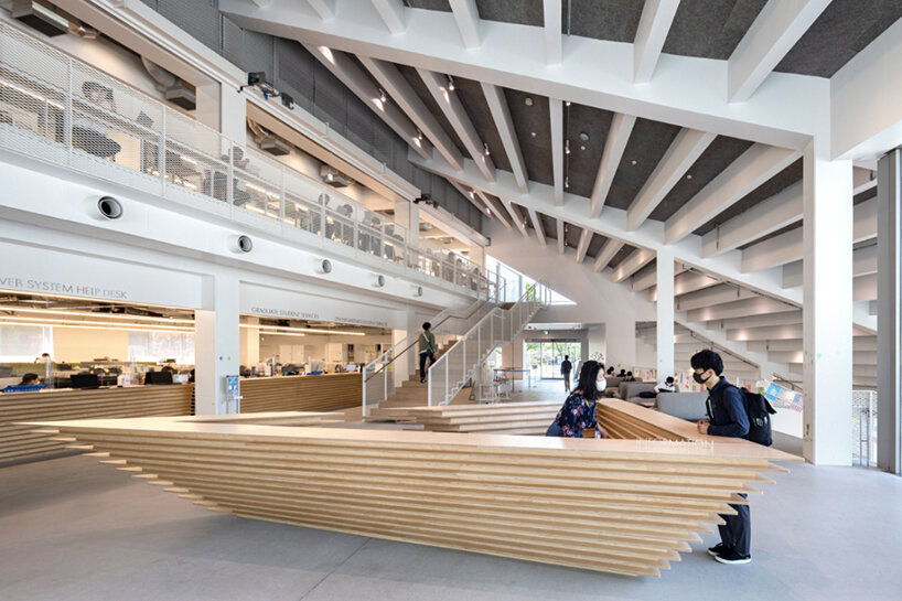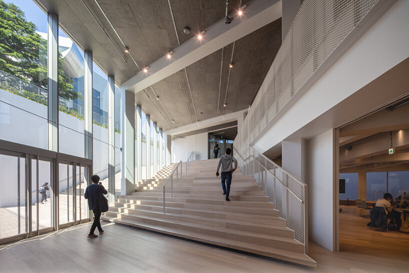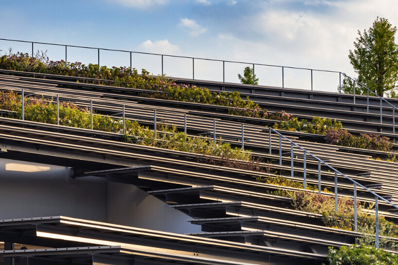 the project sits like a ring placed over the terrain, with its funnel-like roof forming a shaded perimeter walkway and an introverted core.