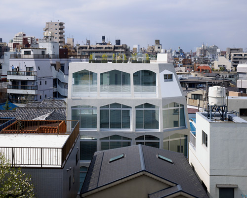 in tokyo, local office kentaro ataka architectural design has completed a series of vaulted tunnel-shaped apartments as part of a residential complex named ‘hasu house’. located in a densely populated region of the japanese capital, the five-storey scheme features distinctive apertures cut into its façades. the complex comprises 11 individual units in addition to a penthouse level situated at the uppermost level of the structure – this area of the scheme serves as the owner’s private residence. each storey offers large floor-to-ceiling windows that not only fill internal volumes with natural light, but also provide expansive views across the city below.
