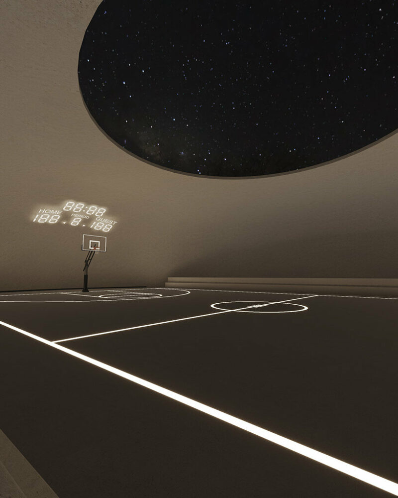 the project sits like a ring placed over the terrain, with its funnel-like roof forming a shaded perimeter walkway and an introverted core.