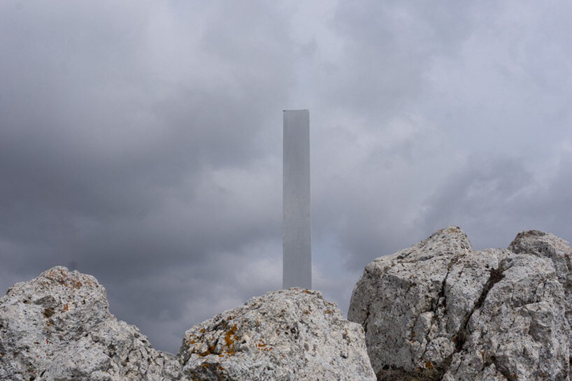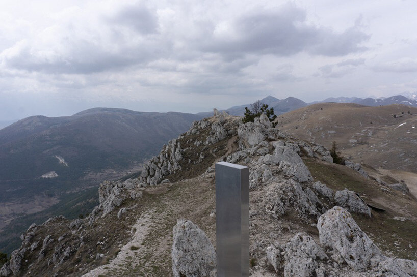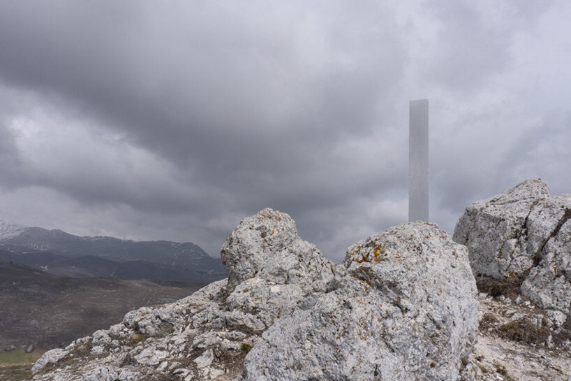 The installation by Edoardo Dionea Cicconi (find more here) is perched right by the mountaintop castle of Rocca Calascio, one of the oldest standing forts in Italy. Set at a height of 1,460m (4,790ft), Kinetic Mirror presents itself as a slender vertical structure with a reflective metal cladding, generating a strong contrasting effect with the stone walls of the castle and the jagged mountainous surroundings.