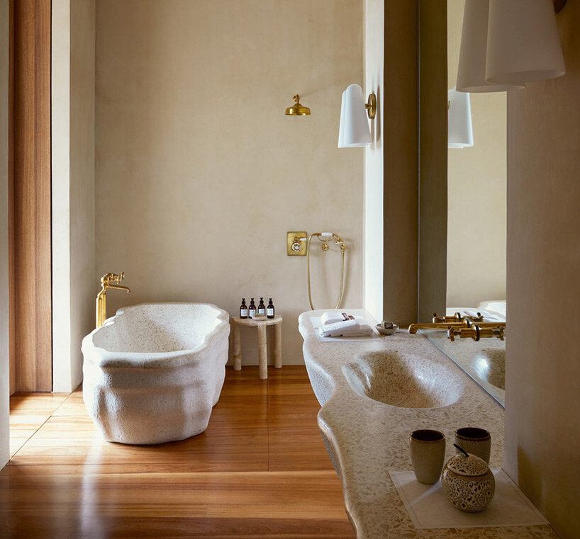 the project sits like a ring placed over the terrain, with its funnel-like roof forming a shaded perimeter walkway and an introverted core.