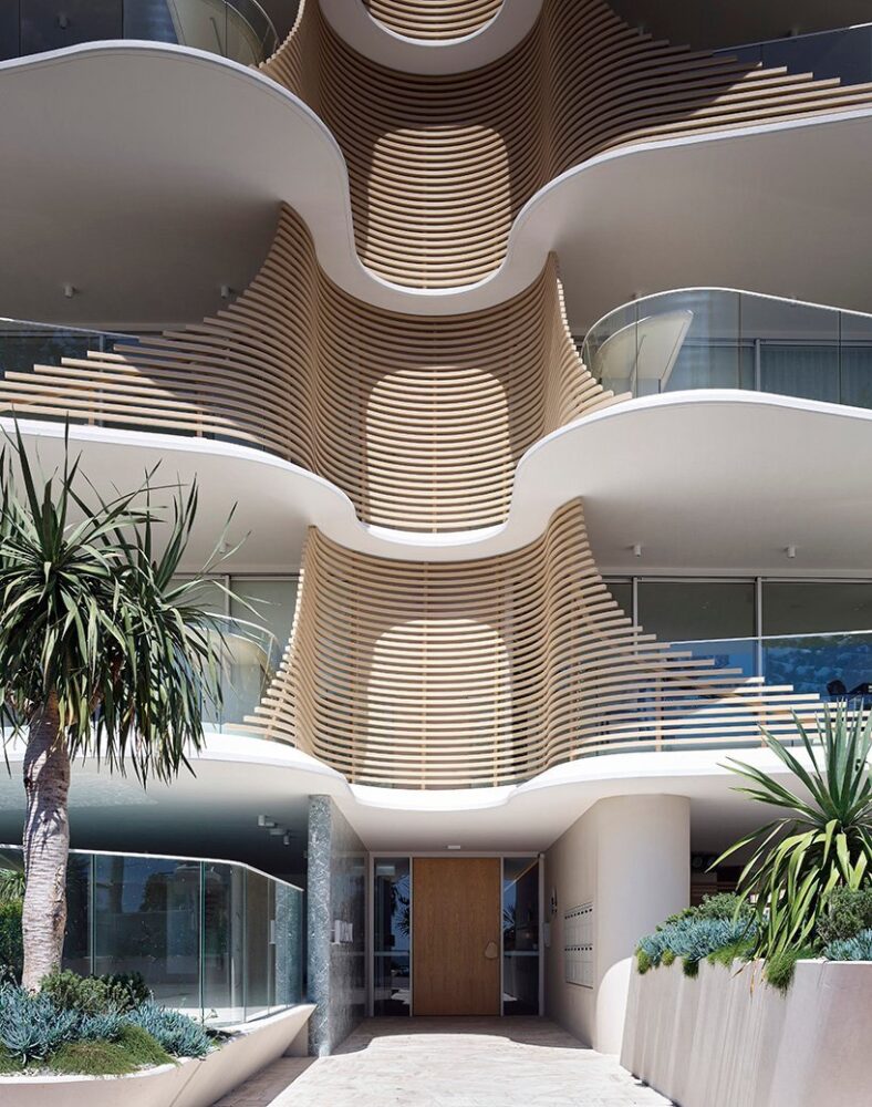 representing a respectful yet regenerative development, the structure responds to passive design principles. its undulating balcony slabs are strategically overlapped to provide shade to the outdoor spaces below. inspired by the way the norfolk pinecone protects its seeds, sliding slatted screening offers privacy and protection from the weather conditions.koichi takada architects builds 'norfolk' as a series of overlapping undulating slabsall images by scott burrows