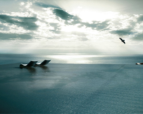 the ‘mirage’ residence is located on a steep and rocky hillside on the greek island of tinos, and overlooks the aegean sea with expansive views. designed by kois associated architects, the house was intended to closely integrate with its surroundings, described as ‘an invisible oasis hidden from the unsuspected eyes.’ the single level living space is covered by a rimless pool, creating a visual effect of water extending to the horizon and merging the dwelling with the seascape. additional materials are taken directly from the local landscape, so as to match the existing context.
