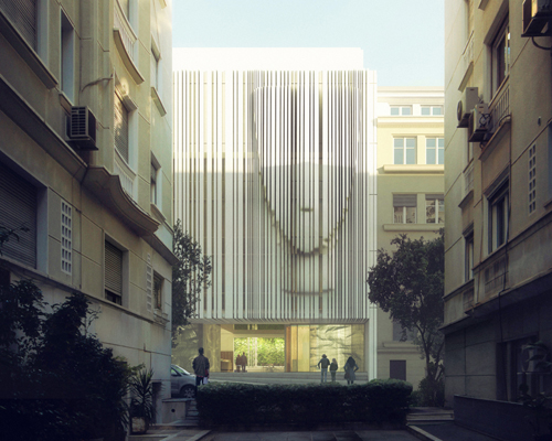 the proposal by kois associated architects for the redesign of the museum of cycladic art in athens, greece, aims to enhance the building’s urban pretense and public interaction. the existing street frontage is reminiscent of the international style, encased within the tight city fabric. a large portion is covered with reflective glass, which on their inner side are fitted with rigid panels to prevent sun reaching the exhibition rooms where steady conditions of lighting are required. wanting to integrate a new design with the structure, a floating array of vertical elements clearly marks the entrance point. drawing people in from the outside, the proposed scheme provides shade and shelter, while also acting as an urban meeting point.
