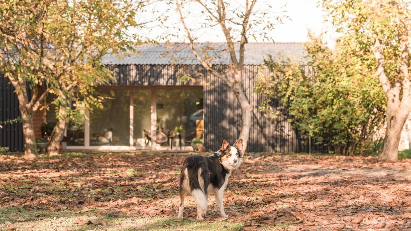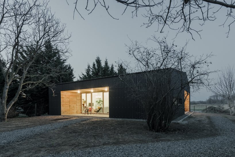 hidden between a walnut grove and an open hay field, this hungarian house sits with its bold and corrugated façade – an unconventional appearance in residential design. architecture firm KONKRET studio completed the award-winning project as a low-cost, but durable single-floor home for a family of four, with a strong connection to the garden.