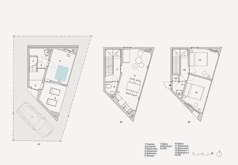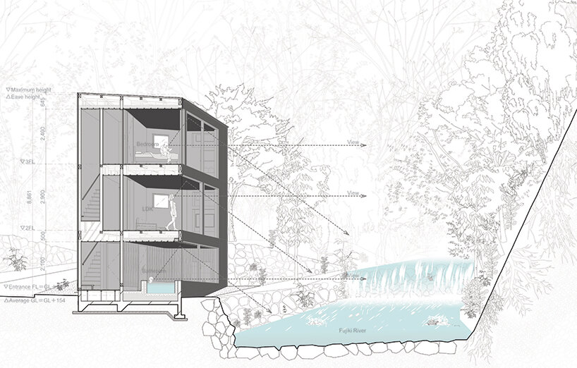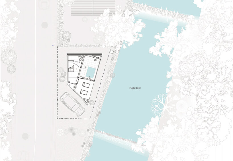 the project sits like a ring placed over the terrain, with its funnel-like roof forming a shaded perimeter walkway and an introverted core.