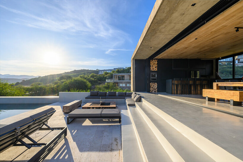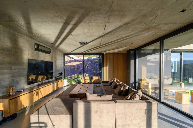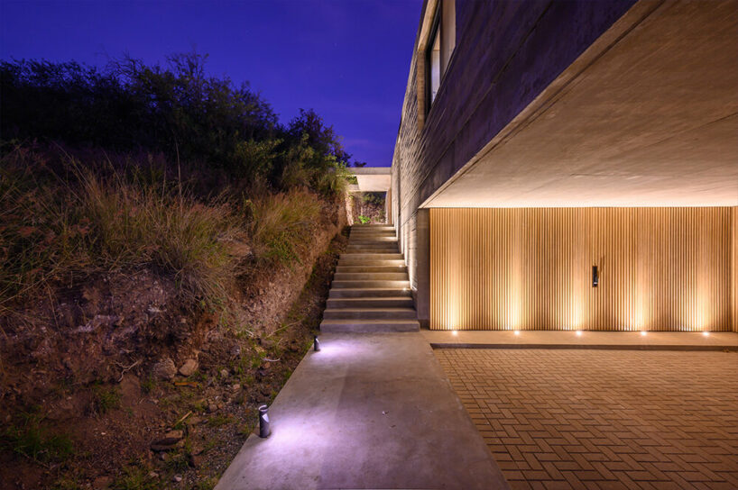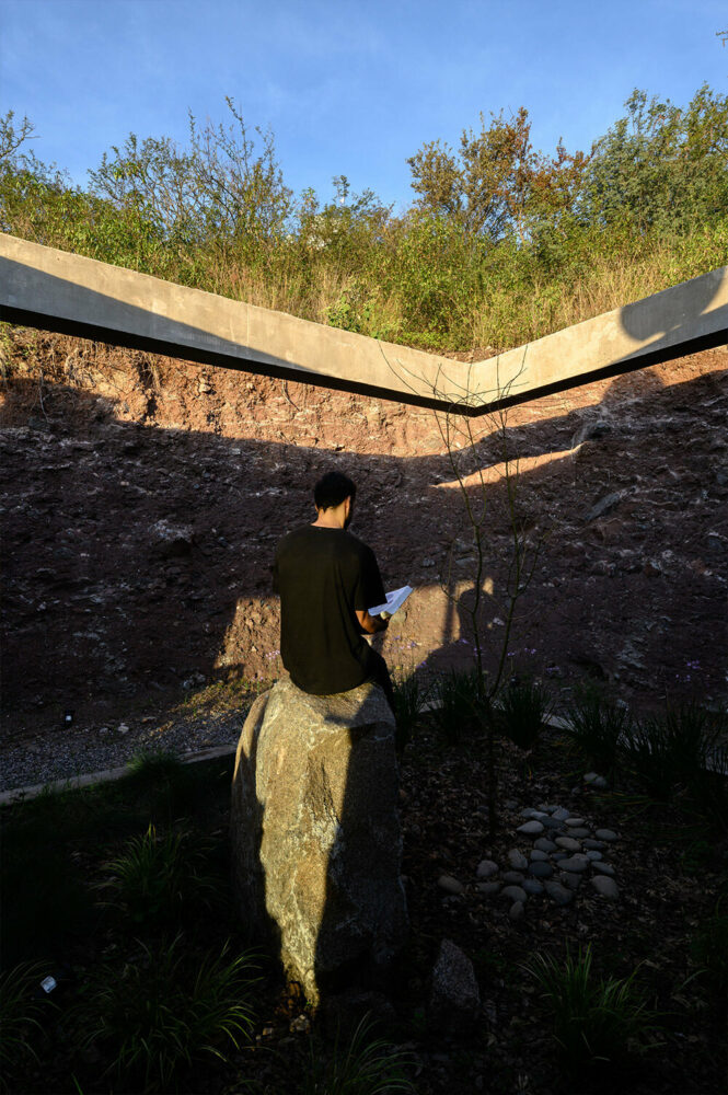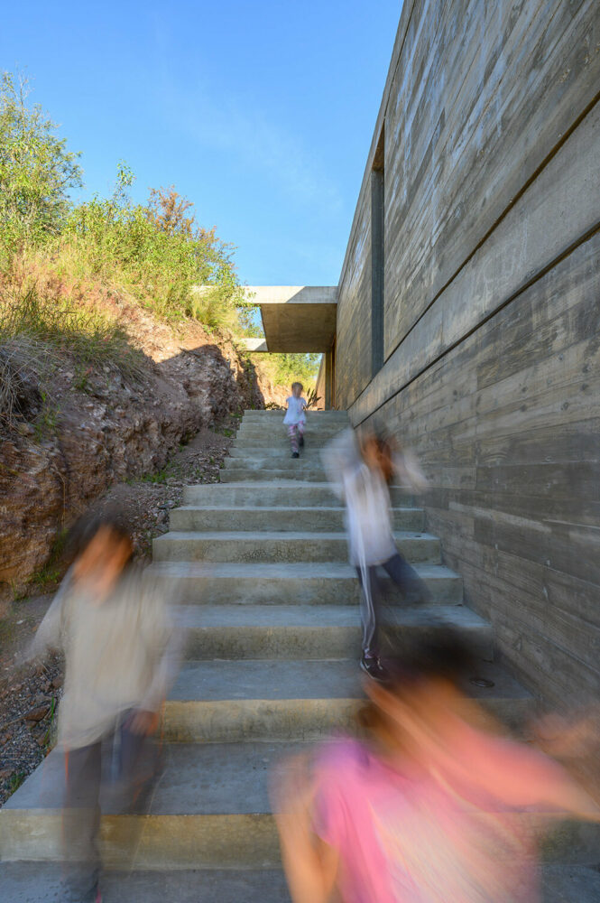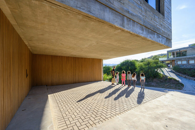 the project sits like a ring placed over the terrain, with its funnel-like roof forming a shaded perimeter walkway and an introverted core.