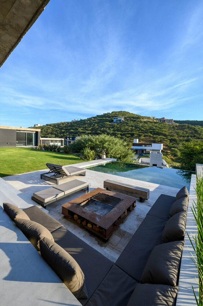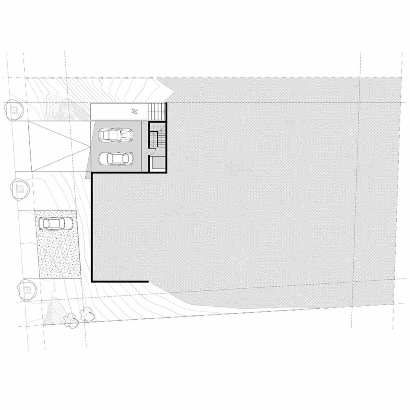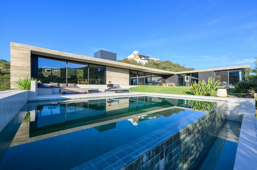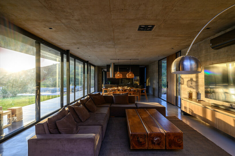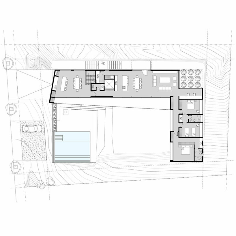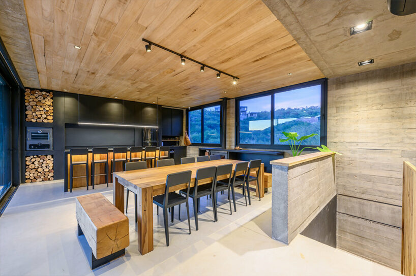 the project sits like a ring placed over the terrain, with its funnel-like roof forming a shaded perimeter walkway and an introverted core.