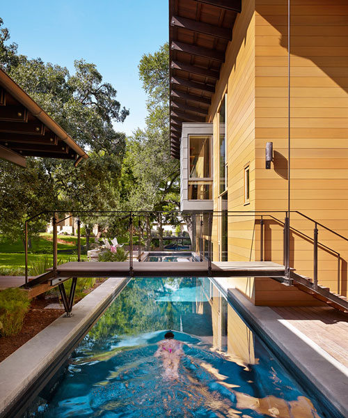 in texas, architecture firm lake flato has completed the ‘hog pen creek residence’, an expansive lakeside retreat connected by a long exterior boardwalk. situated at the confluence of hog pen creek and lake austin, the dwelling was envisioned by its owners as a playful property that encouraged outdoor living, and maximized the site’s tranquil views. the home’s L-shaped footprint and orientation helps negotiate heritage oak trees, a steeply sloping site, and aggressive setbacks from the water. the boardwalk connects a series of structures that step down the hillside, traversing a 75-foot lap pool, and terminating at a screened pavilion by the lake’s edge.