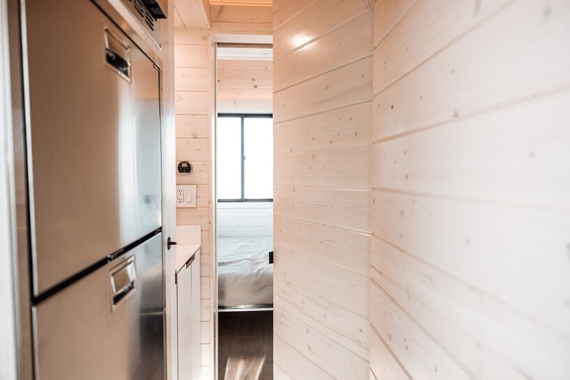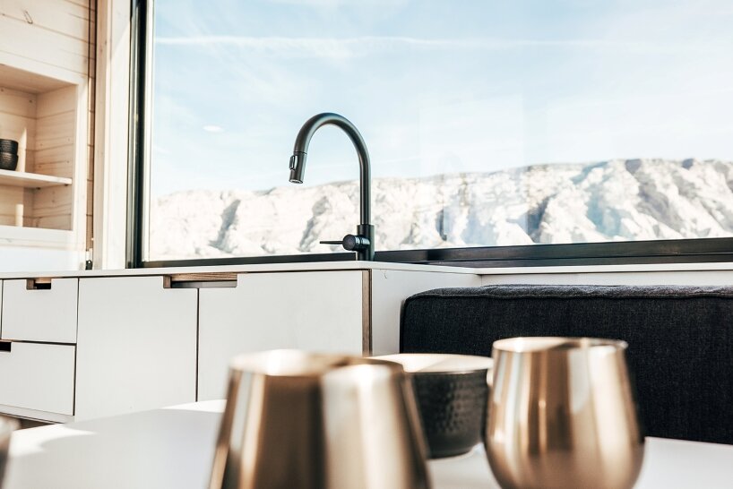 the land ark RV ‘quatro’ (see more here) is named after 20cm wide windows with 4° angles. its living/kitchen area is ideal for dining, working, or relaxing and quickly converts to a twin sleeper for an overnight guest. down the hall is a split bathroom with a private shower/toilet room and an adjacent vanity. the pivoting bathroom door also latches across the hallway to connect the spaces and offer complete privacy from the living area.