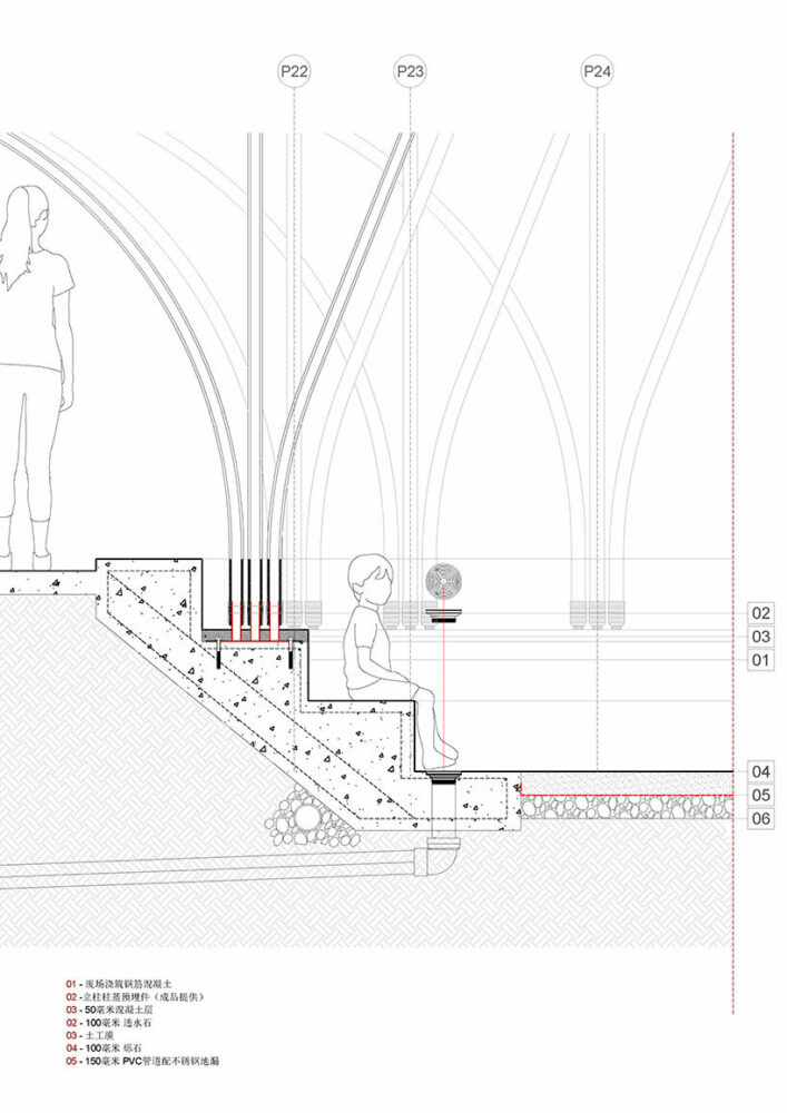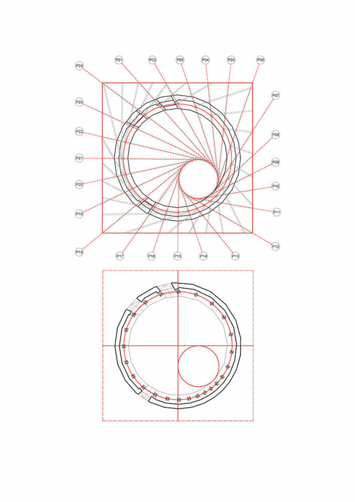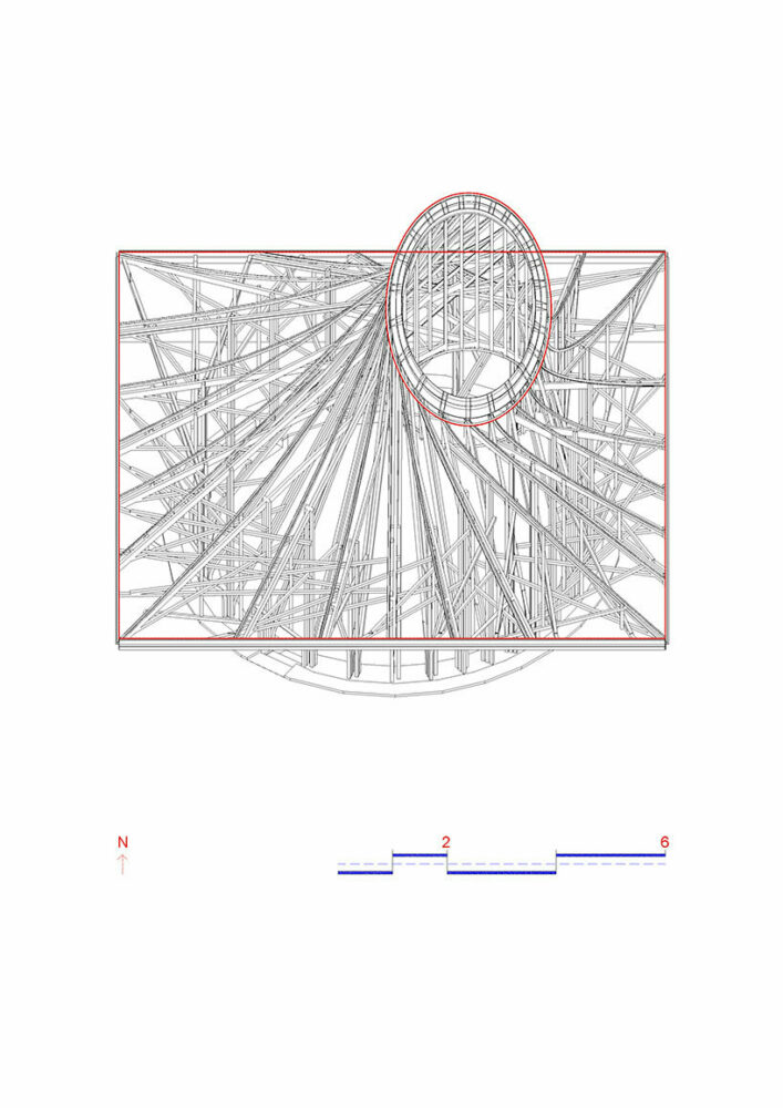 This ‘curtain’ of columns stands as a blurred threshold between the water and the theater’s performance space, its radial orientation lending an ever-changing perspective of the site. An oculus overhead invites natural sunlight to enter deep into the space, enhancing the transforming experience as the light gradually shifts with the changing sun throughout the day.