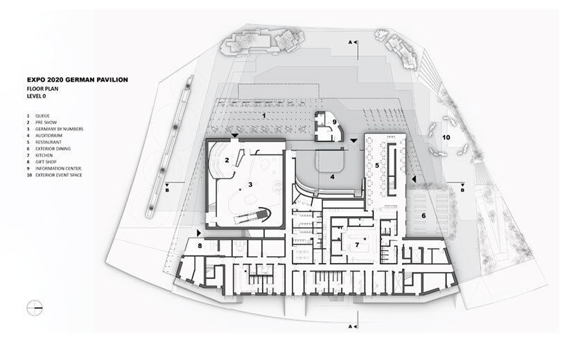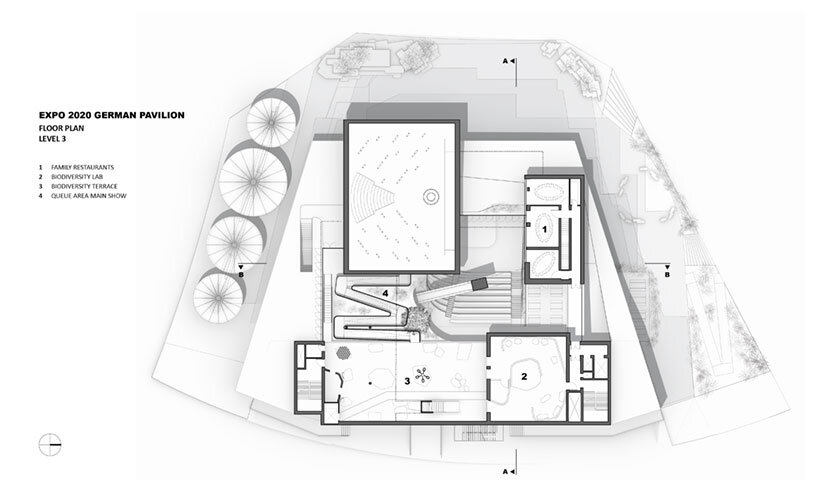the message of the german pavilion at expo 2020 dubai is the structure itself. the minimum amount of material creates maximum volume. three cubes were stacked on top of a plinth with other functions (restaurant, pre-show, office, back-of-house) formed as an abstract landscape. this created a large volume at the centre, and a roof creates shade and comfort — a technical cloud. a sandwich of three parts: landscape, stacked cubes, roof. people between nature and technology.