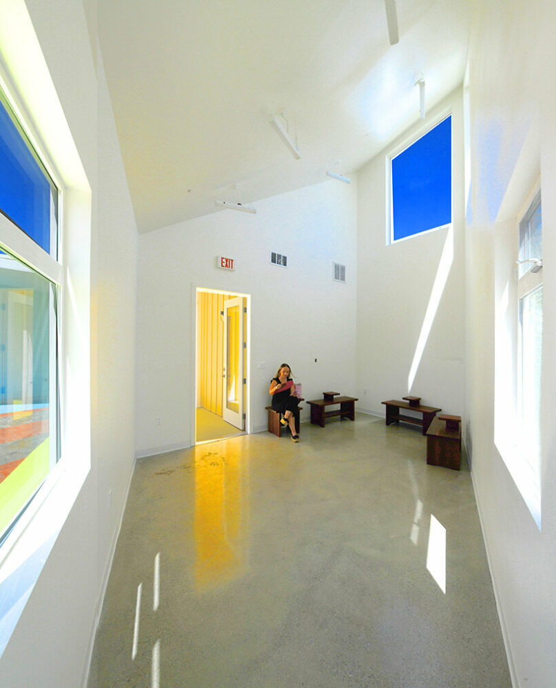 the project sits like a ring placed over the terrain, with its funnel-like roof forming a shaded perimeter walkway and an introverted core.