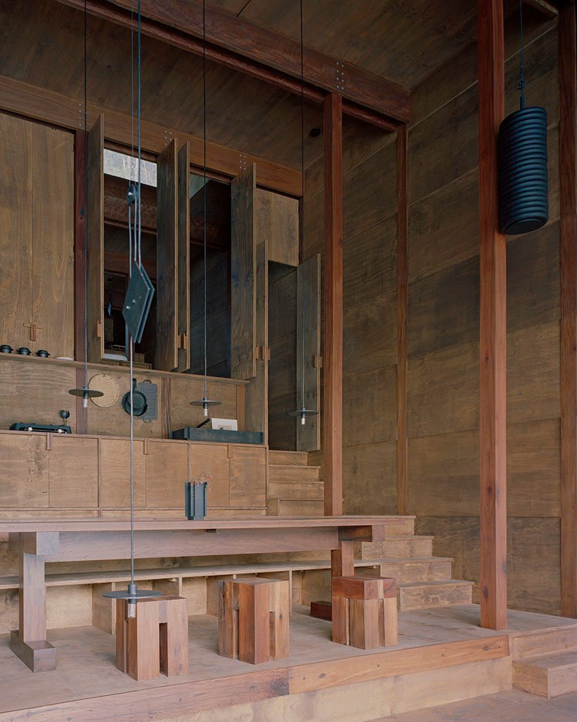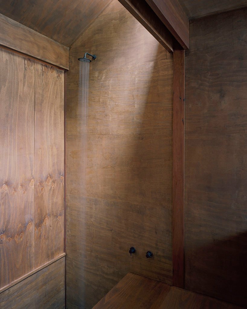 The steeply sloping site location is acknowledged by the structure’s stepped longitudinal section and densely spaced structural grid. Meanwhile, the interior is entirely focused on one single large north-facing window orientated towards the creek edge. The window is split in half and can be hoisted upwards using counterweights, allowing the landscape into the tranquil timber-lined interior space. Two small rooms open to a patio protected from the wild nature surrounding the building. Above the house, the flat roof offers a large terrace in the tree canopy.