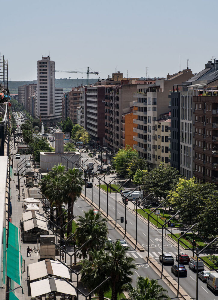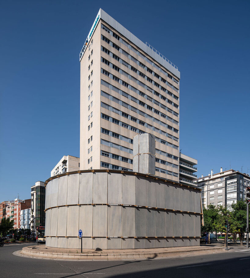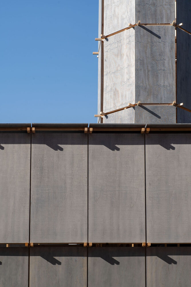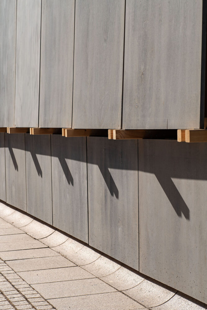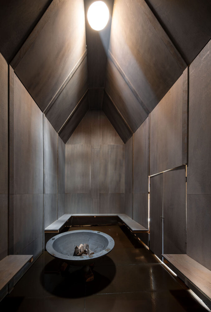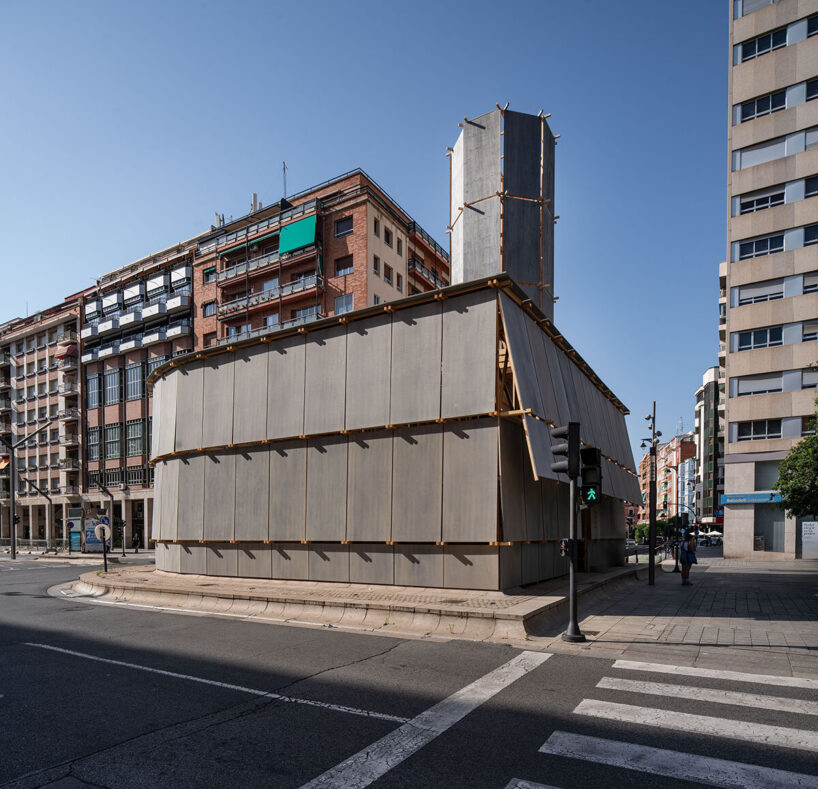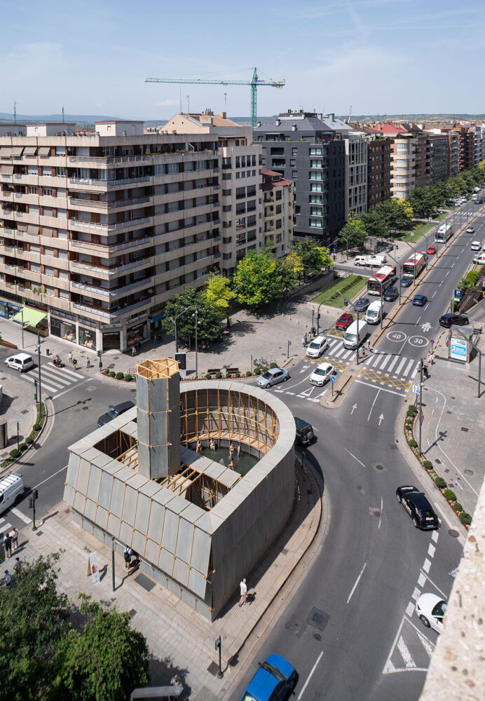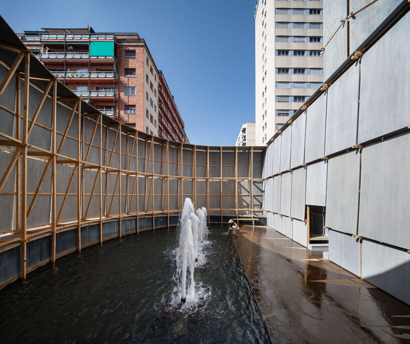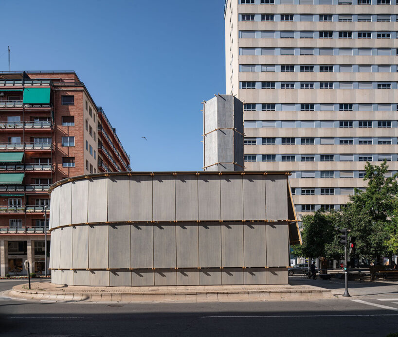 the project sits like a ring placed over the terrain, with its funnel-like roof forming a shaded perimeter walkway and an introverted core.