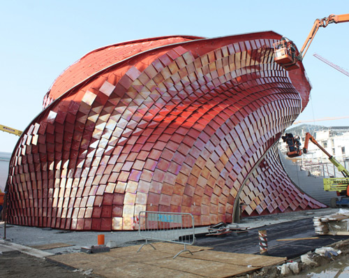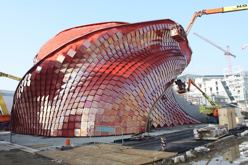 influenced by traditional chinese landscape paintings, construction for studio libeskind‘s vanke pavilion is underway. due to debut at milan expo 2015, the 1,000-square meter pavilion features a sinuous geometrical pattern that flows between inside and outside. incorporating technology into the exhibition, screens showing glimpses of the importance of the shitang in the everyday life of ordinary chinese citizens whilst the roof will feature a bamboo garden and panoramic views of the other pavilions and landscape. the distinctive scale skin of the building is cladded in an innovative red, shimmering metal tile which libeskind and casalgrande padana collaborated to create.