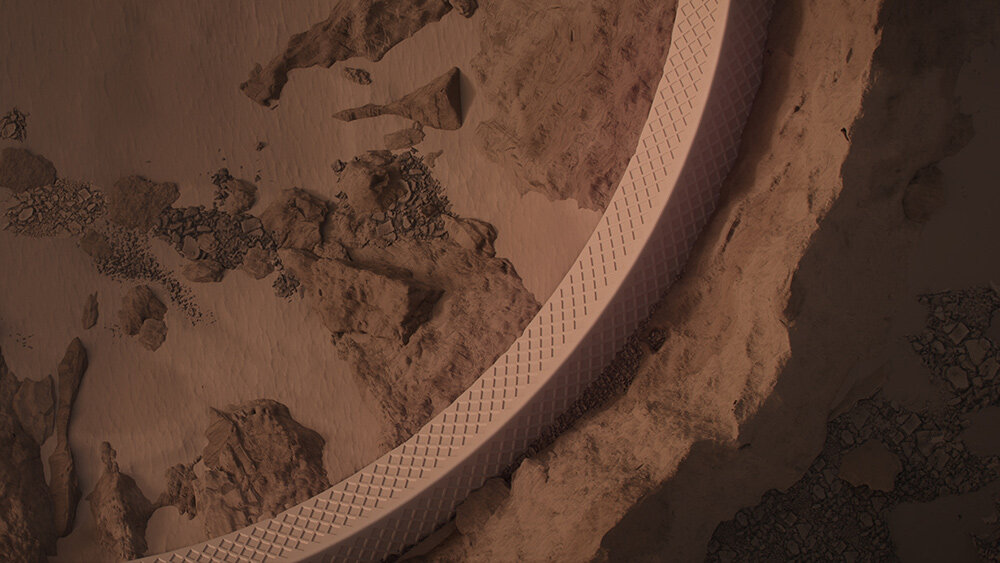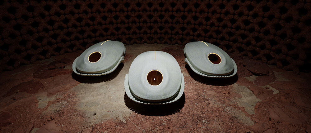 toward the interior, half part of the shell is occupied by sleeping accommodations, and the other half by technical, research, and common areas. furthermore, a public hall stretches through the entire structure serving as a place for long walks and a dining area. the architects’ aim was to incorporate a beautiful yet functional space into a rather harsh martian landscape. for this reason, the interiors are imbued in natural and earthy shades in combination with rocky textures. a mixture of two worlds — the unknown mars and the near-and-dear earth.