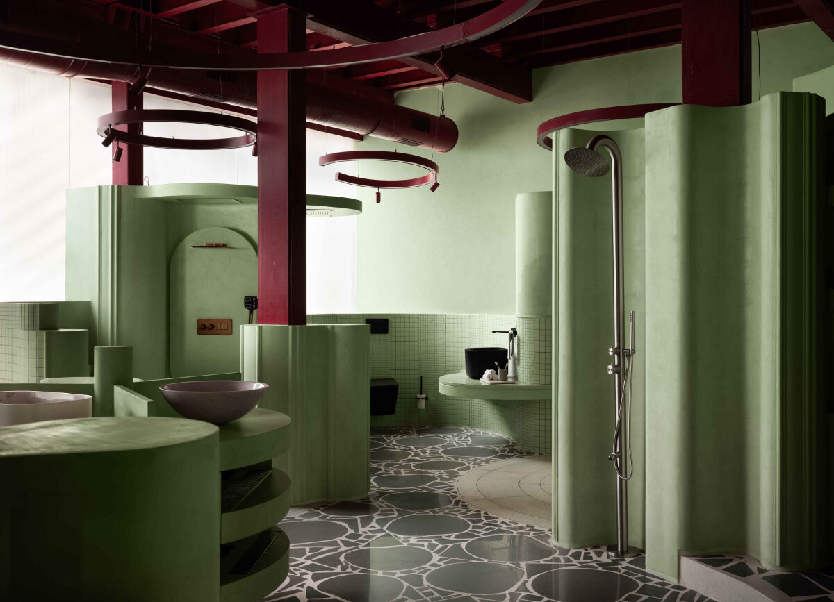 Engulfed in a monochromatic playground of color and geometry, MuseLAB’s new showroom diverges from conventional retail layouts to reimagine the experience of bathware discovery lounges. The flagship store for Aquant in South Mumbai, India, aptly named Sorbet, revels in the textures of the delicacy alongside the intrigue of the unexpected with monolithic volumes and layers wrapped in ‘the zest of lime and the tartness of berries’. These velvety yet granular hues of green unfold across all surfaces, appearing as paint, terrazzo, and mosaic elements, accented with berry red.