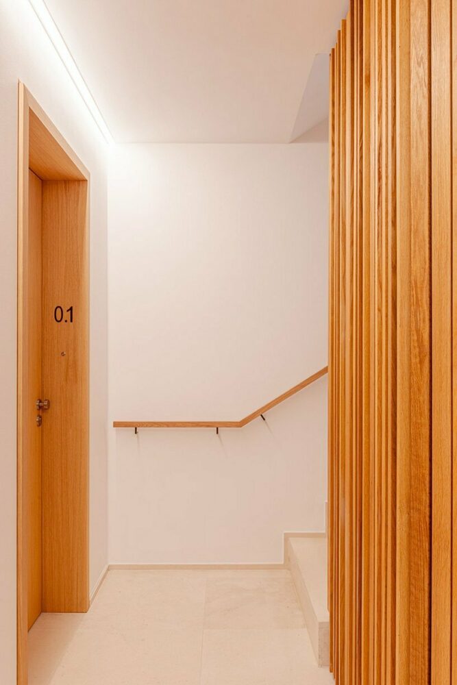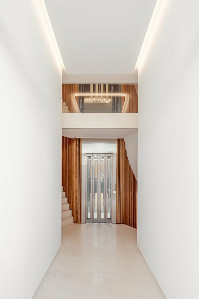 The residential development applies limestone plates and aluminum finishings all over the external surface forming five solid volumes that are separated by horizontal glass openings that run along the structure. Set on a prominent corner plot, the building enjoys panoramic views throughout the interior. The residential construction developed by Solum Real Estate arranges two luxury apartments per floor level on both the ground and first floors. In a total of six apartments, one of them, the generous penthouse, is a duplex that boasts large open terraces. All the exterior lines shape organic and smooth forms softening the edges of the housing block and creating a fluid architecture.