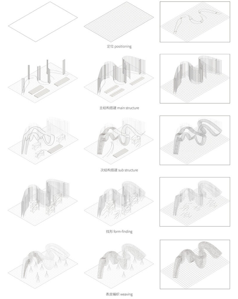 the team at lin architecture comments on the process of realizing its bamboo pavilion in shanghai:during the process of more than two weeks, the whole construction combines research and participation. with the help and guidance of professional workers, students were able to experience the project from the start to its completion.’