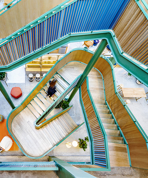 linehouse wework weihai lu: a green staircase weaves through the circulation space, joining the triple height space