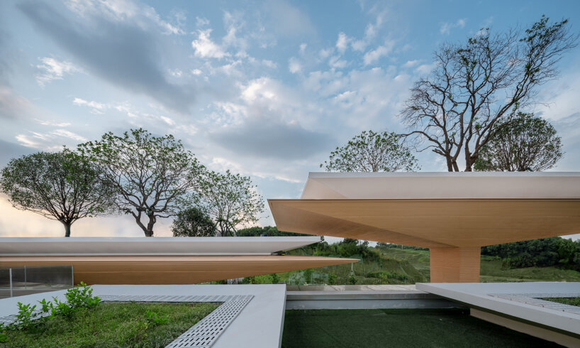 Responding to the flat and highly urbanized context, Line+ Studio (see more here) fitted the project site with an artificial ‘slab hill’ to create a more suburban setting. Just like the building modules, umbrella-shaped units combine to shape the inserted hill. According to Peidong, the umbrella archetype is a form commonly found in nature — particularly apparent in mushrooms and trees like the Dracaena Draco. Apart from its bionic traits, this particular shape also presents strong rational properties that are ideal for architectural projects.
